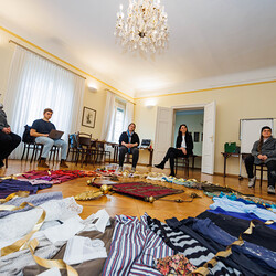 Es ist durchaus üblicher Brauch, eine Fahne zu restaurieren, indem man die Goldstickerei vom alten, mürben Trägerstoff abhebt und auf einen neuen Trägerstoff aufnäht. Beim Workshop wurde aus mitgebrachten Alltagsstoffen ein neuer Trägerstoff, ein Netz aus Symbolen, genäht. Kelch und Monstranz, Symbole für Jesus Christus, wurden aus der zerschlissenen Fahne herausgelöst und auf einen neuen Grund gelegt – in unsere Zeit übertragen.