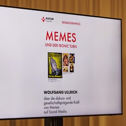 Bei seinem ebenso analytischen wie kurzweiligen Einblick in die "Mem-Archäologie" der letzten zehn Jahre sowie im Gespräch mit Moderator Florian Traussnig und dem studentischen "Meme-Lord i.R.", Lukas Pucher, stellte sich der bekannte Medientheoretiker und Kulturwissenschaftler fernab von jeglichem Kulturpessimismus folgenden Fragen: Wie weit prägen diese über Themen wie Religion, Politik und Krieg unsere Gesellschaft? Sind sie nur ein Randphänomen? Oder läuten die Internetglocken gar den "Ironic Turn" ein?
