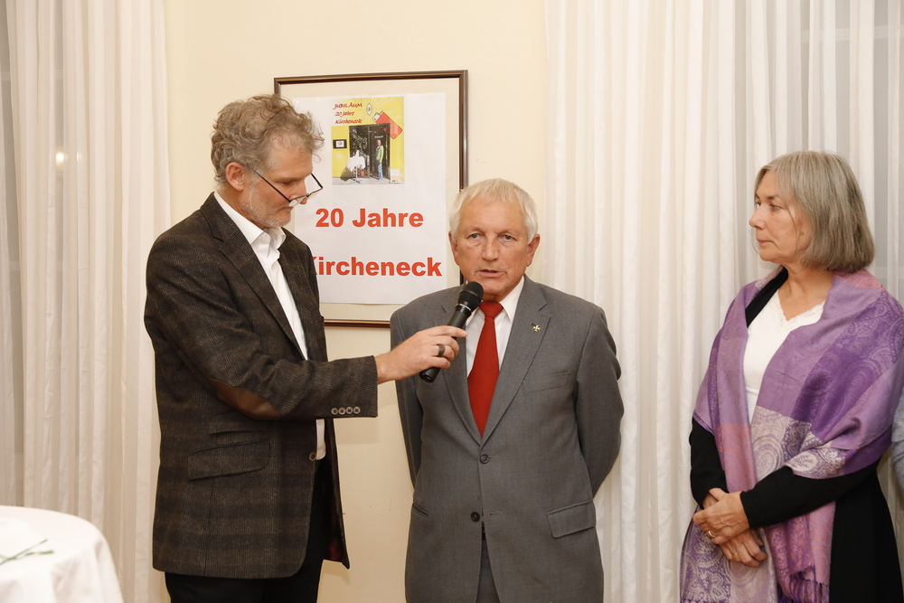 Robert Hautz, derzeitiger Leiter des Kirchenecks, betonte vor allem das Motto des Kirchenecks „Wir haben Zeit für die Menschen“. Ehrenamtliche Mitarbeiter berichteten schließlich von Ihren Erfahrungen und Begegnungen mit den unterschiedlichsten Menschen. Friedrich Hager wies beispielsweise darauf hin, dass Menschen oft mit Problemen kämen, die eigentlich nicht lösbar seien. „Oft hilft aber schon, dass jemand da ist der zuhört“. Monika Walcher erzählte von einer kleinen Missionsaktion, um den Menschen in der Herrengasse zu begegnen, und sich ein Herr sehr herzlich bedankte, dass wir als katholische Kirche auf der Straße präsent sind.