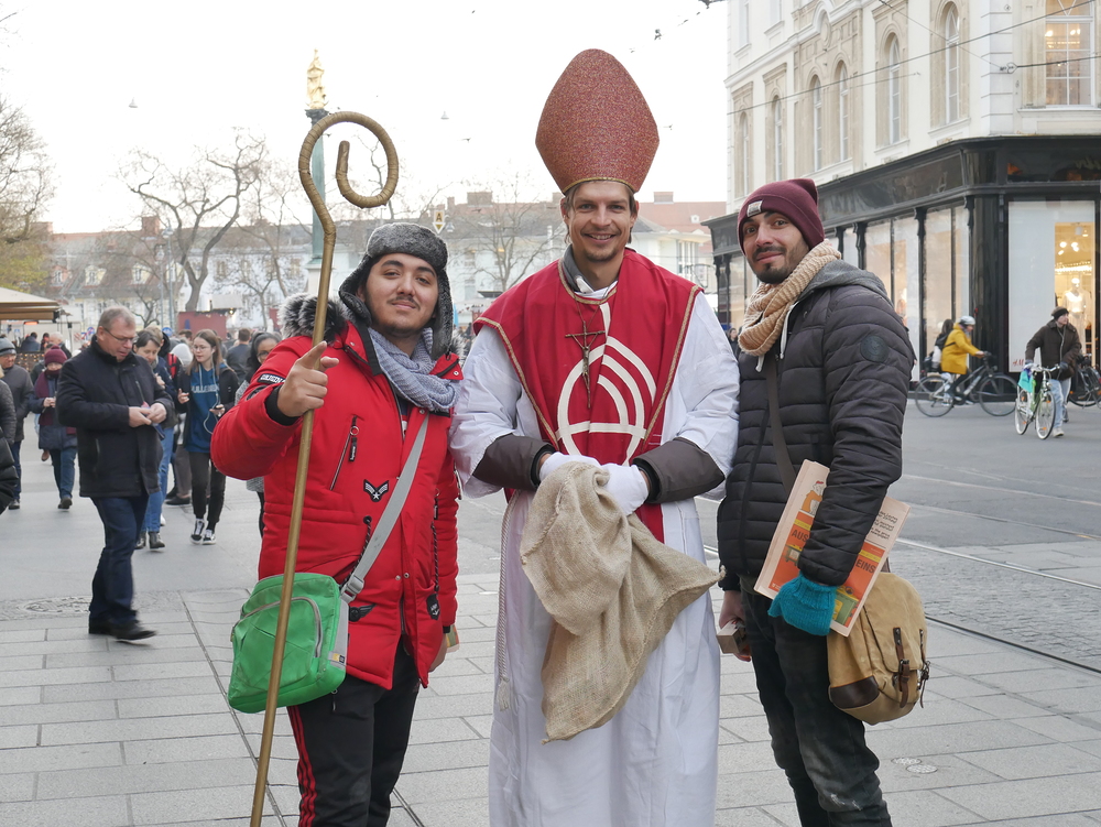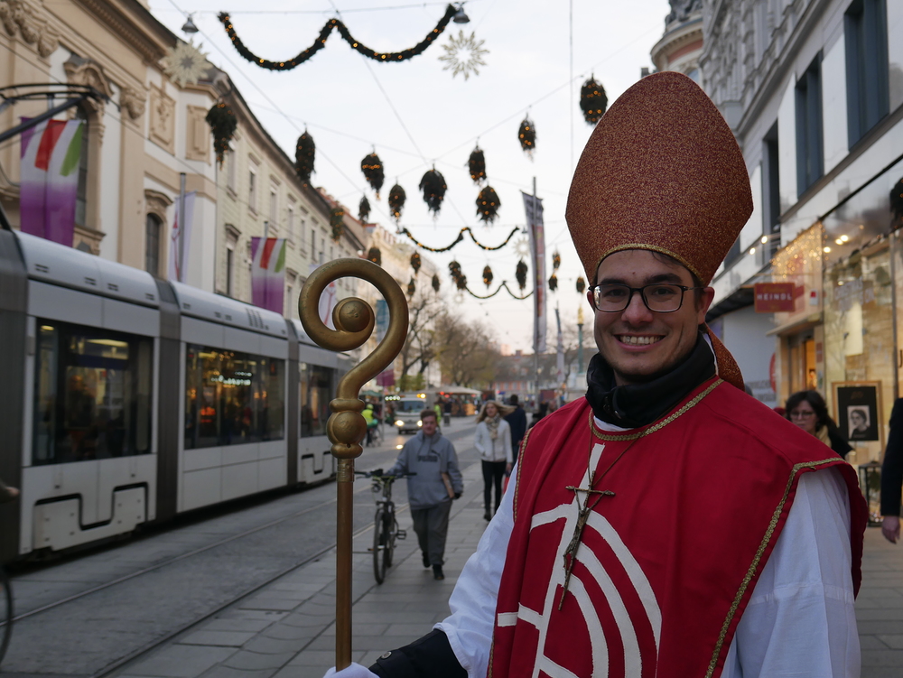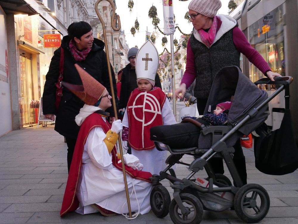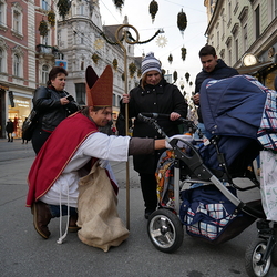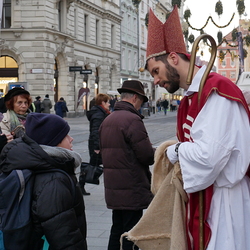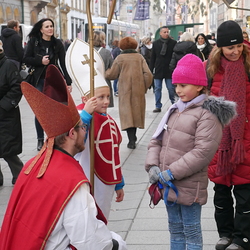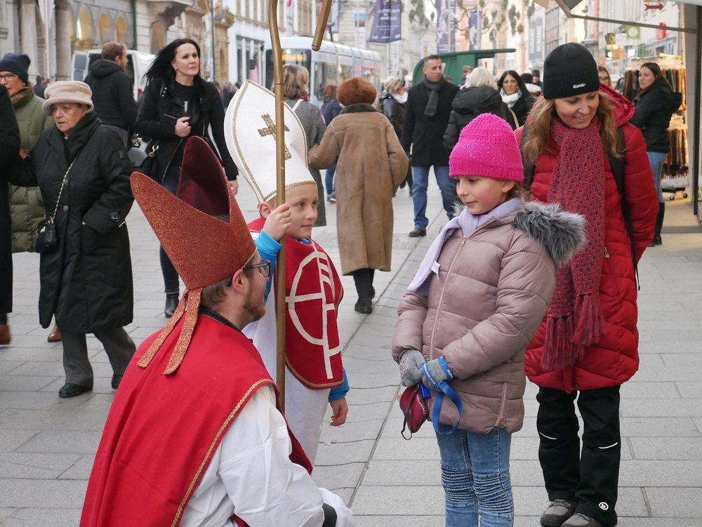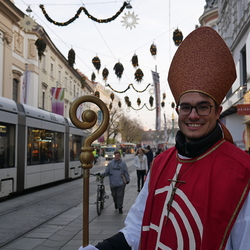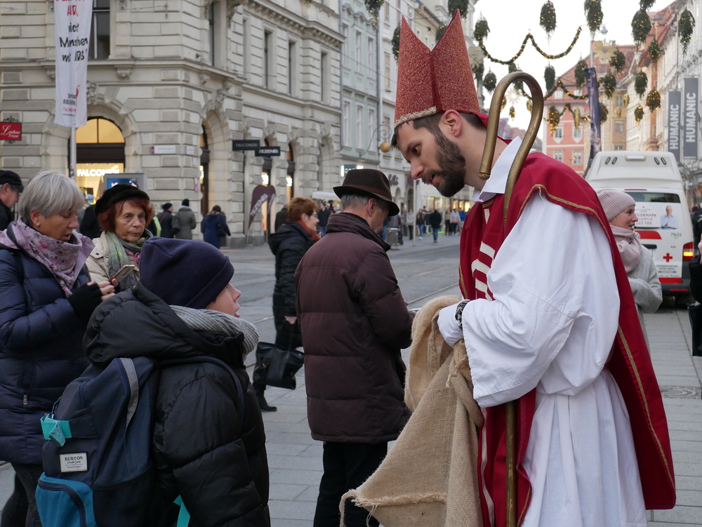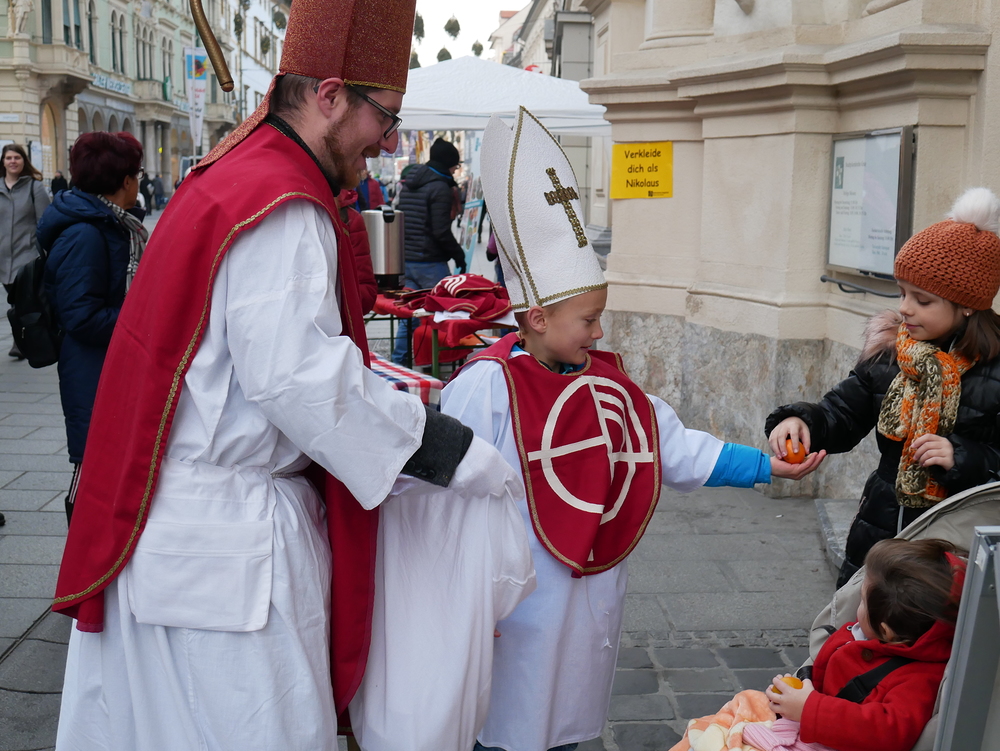 Anlässlich des Nikolaustages (6. Dezember) fand heute in der Grazer Herrengasse die alljährliche Nikolausaktion der Katholischen Jungschar Steiermark statt. Unter dem Motto „Nikolaus hat dein Gesicht“ konnten Kinder bei verschiedenen Mitmachstationen in die Rolle des Hl. Nikolaus schlüpfen und PassantInnen seine Frohbotschaft vermitteln. Bei der abschließenden Segnungsfeier betonte Bischof Wilhelm Krautwaschl „In der Legende von den goldenen Äpfeln bemerkt der Hl. Nikolaus das Leid anderer und hilft sofort. Nicht jede Not ist offensichtlich. Wenn wir achtsamer auf die Menschen um uns herum zugehen, schenken wir schon damit Freude und können ihnen beistehen und helfen.“