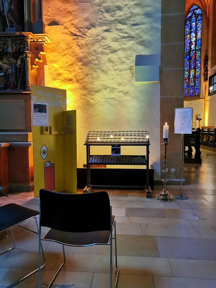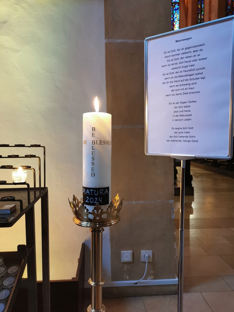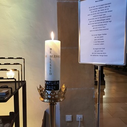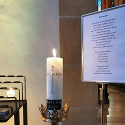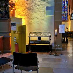 Im linken Seitenschiff - der Weg wird vom Haupteingang mittels Dreiecksständern gewiesen - gibt es die Möglichkeit einen persönlichen Segen zugesprochen zu bekommen (in den angegebenen Zeiträumen wird durchgehend eine Person vor Ort sein). Natürlich können an der Kerzenbar auch eine oder mehrere Kerzen entzunden werden.