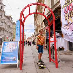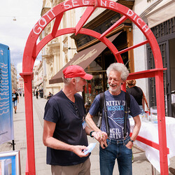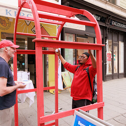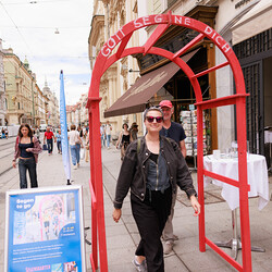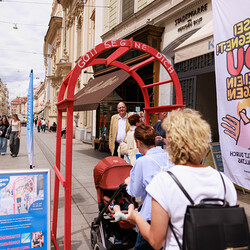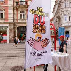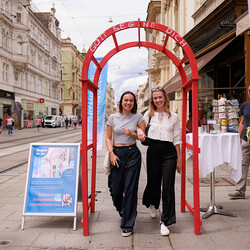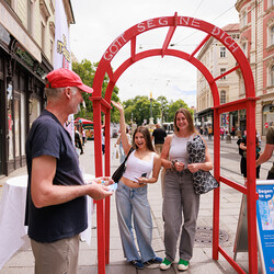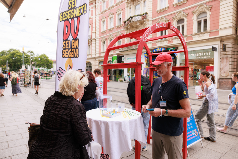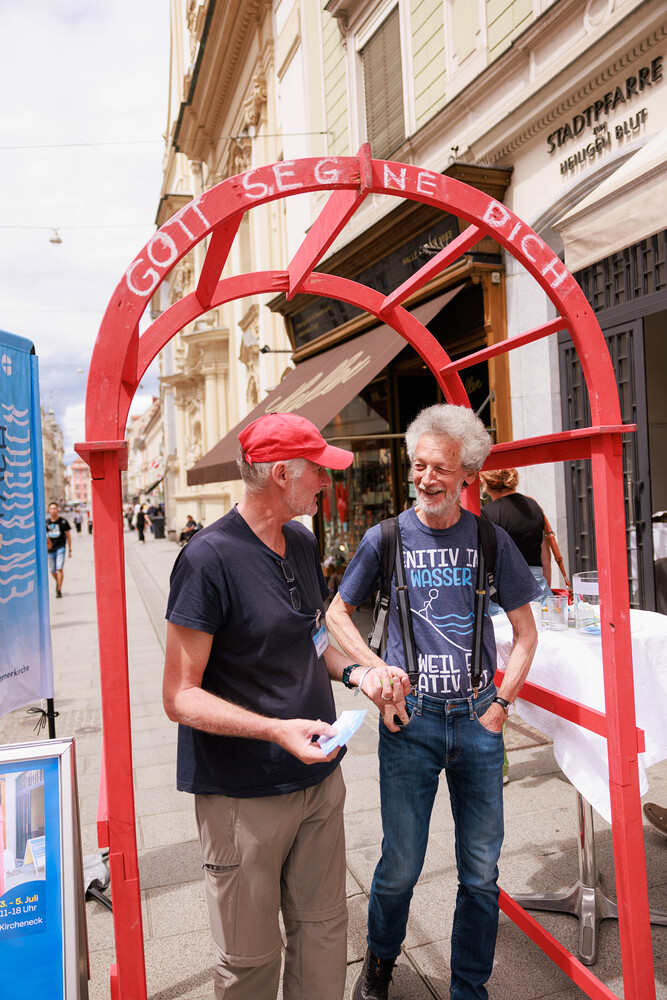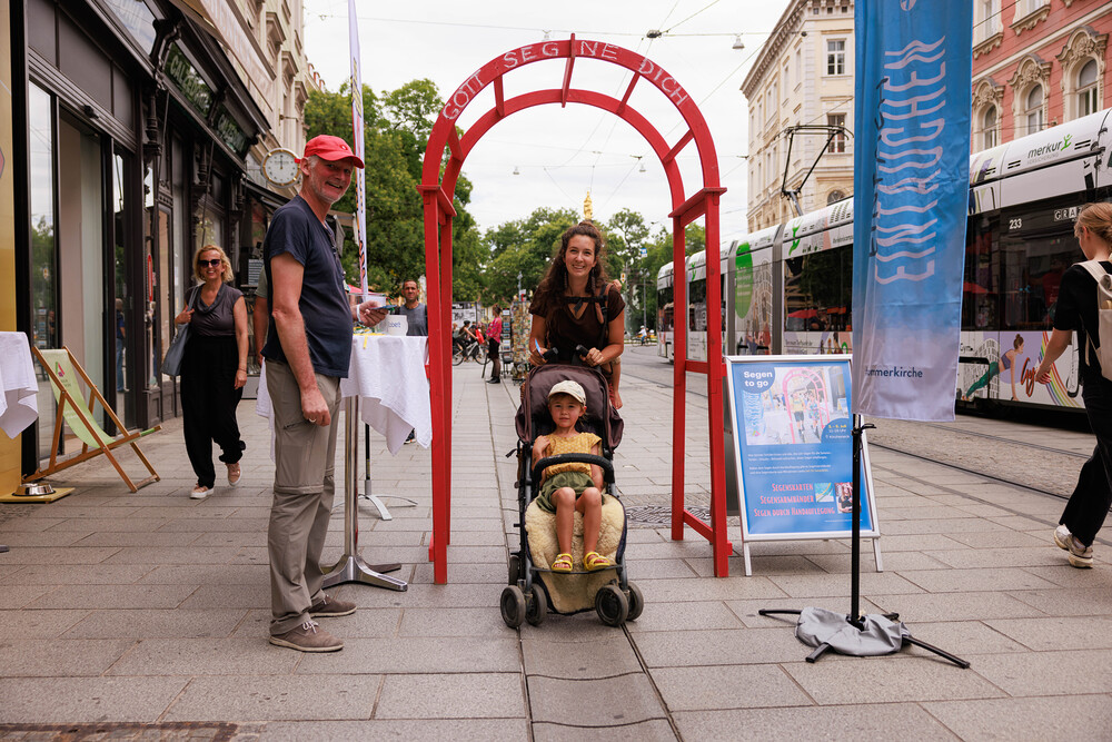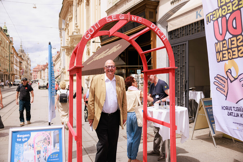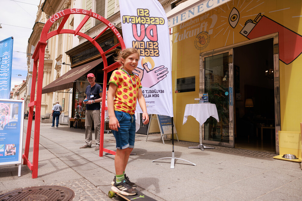 Das rote Segenstor bot die Möglichkeit in den Sommer einzutauchen und den Segen Gottes zu erbitten - für eine gelingende und erholsame Sommer- und Urlaubszeit. Es kam bereits zum dritten Mal in der letzten Schulwoche in der Grazer Herrengasse, vor dem Kircheneck zum Einsatz.