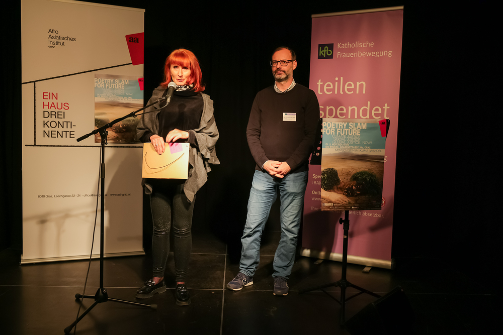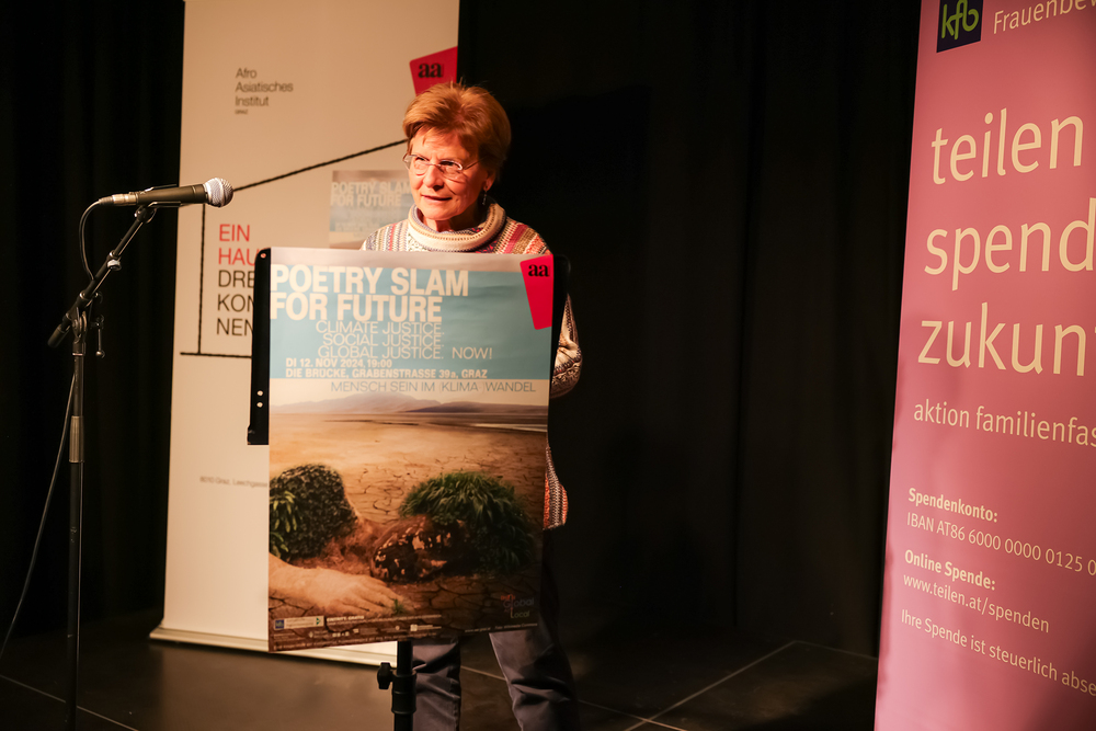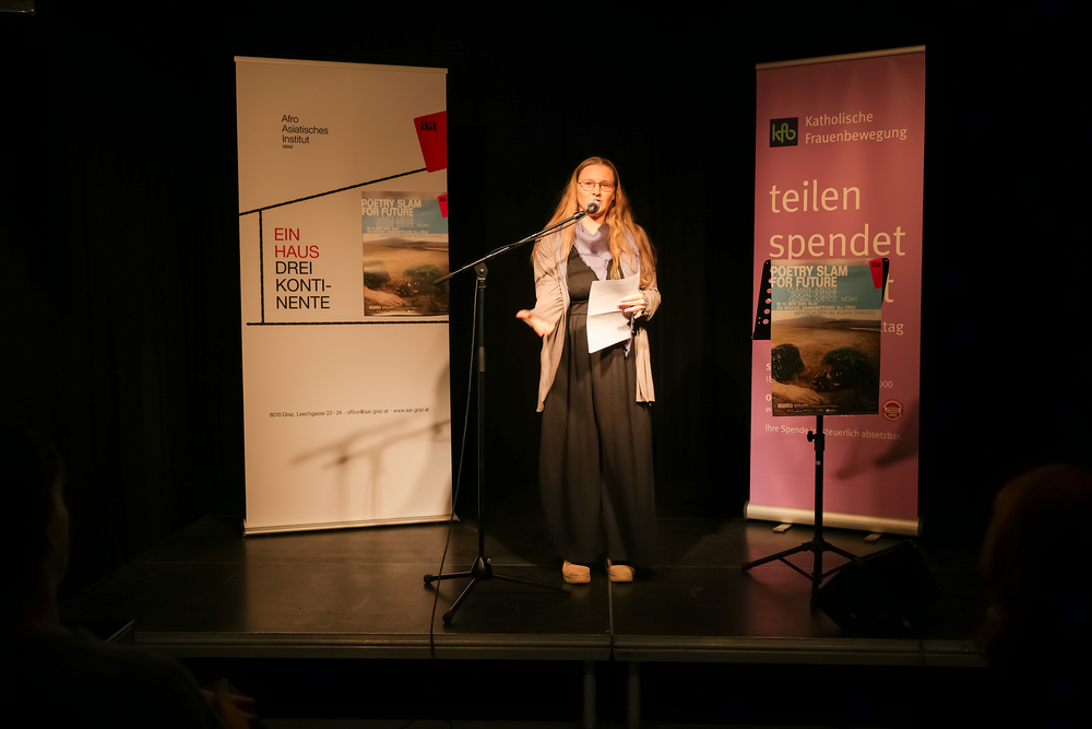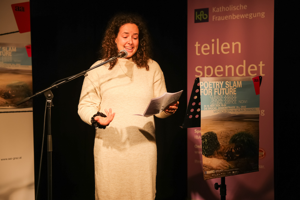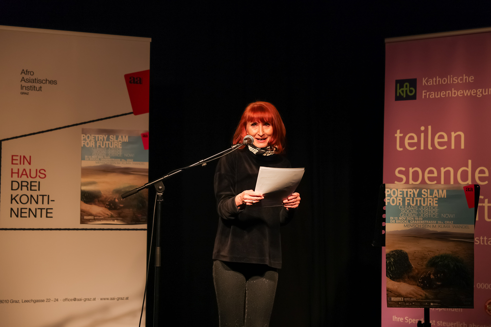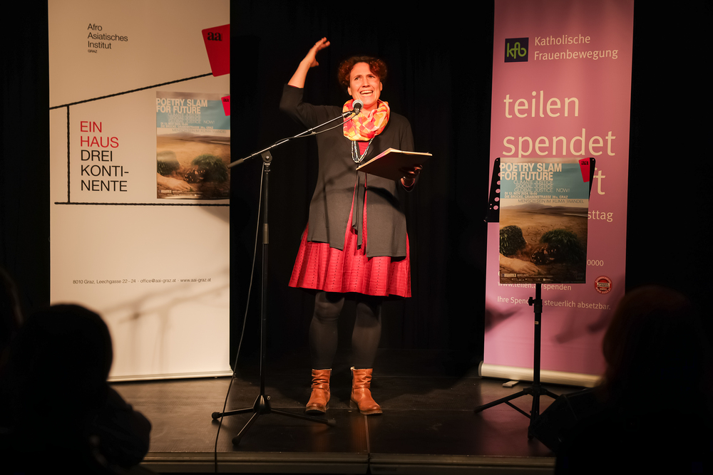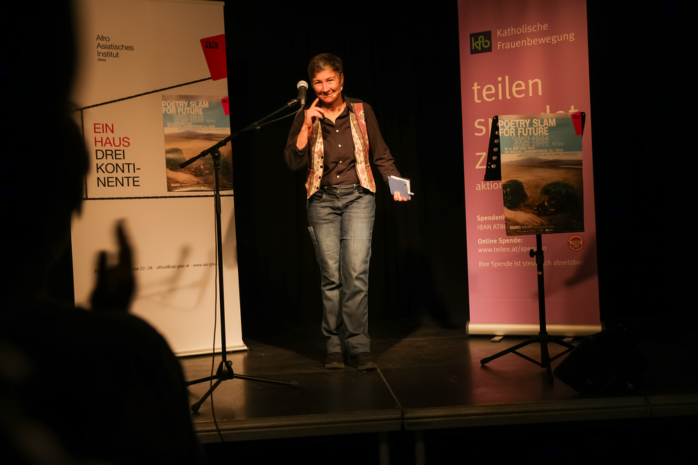 Menschen waren eingeladen, auf der Bühne einen selbst verfassten Text zum Thema (Klima-)Gerechtigkeit vorzutragen, eingebettet in einem gemischten Programm mit Künstler:innen und Aktivist:innen, moderiert von Christine Teichmann, Autorin, Kabarettistin und Slammerin. Organisiert wurde der Abend von der Aktion Familienfasttag der Katholischen Frauenbewegung gemeinsam mit dem Afro-Asiatischen Institut Graz.