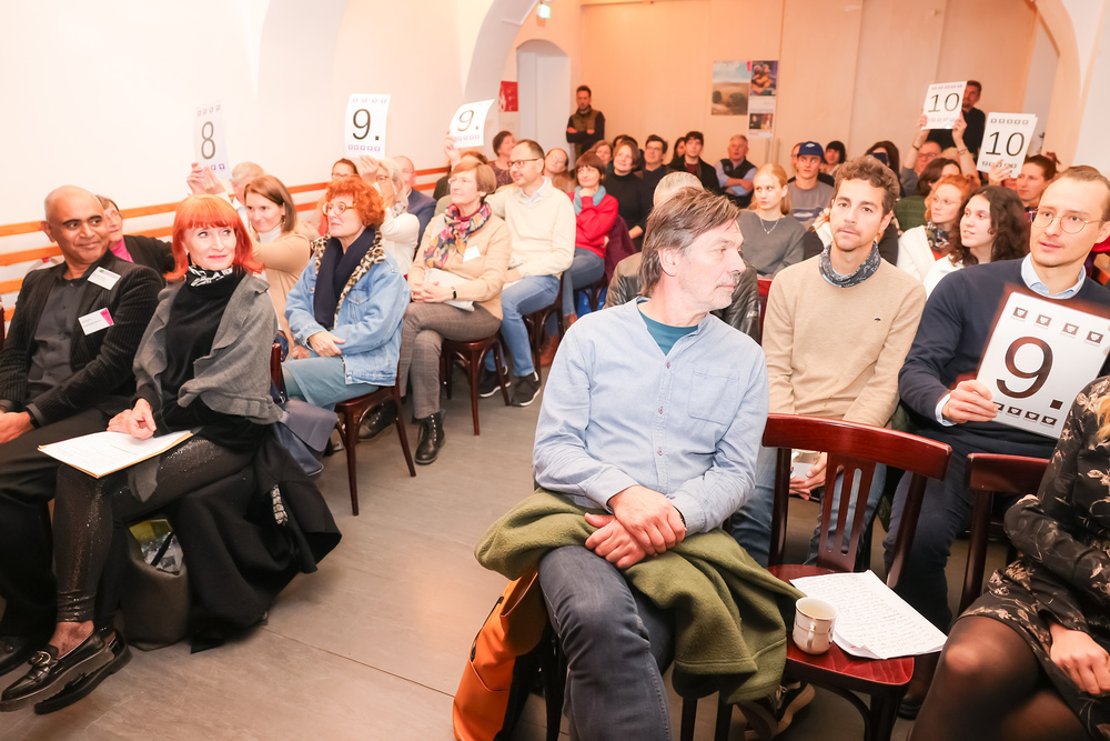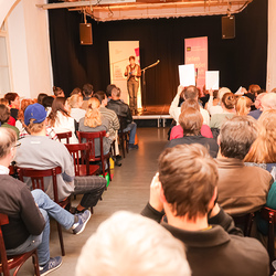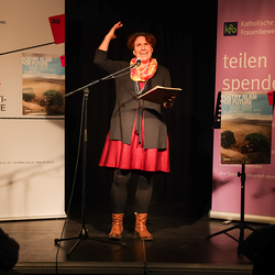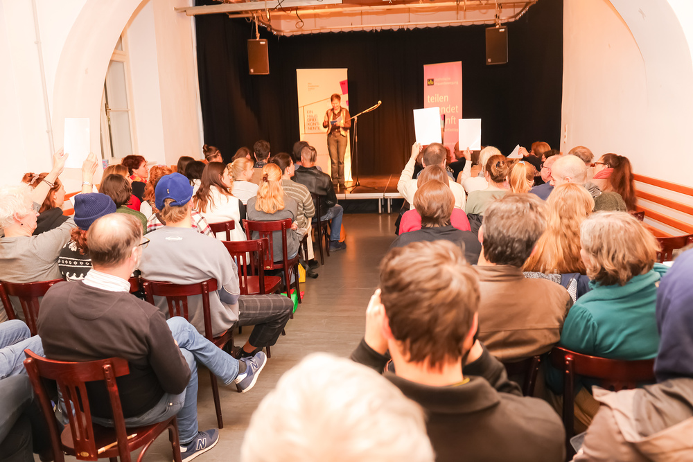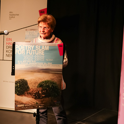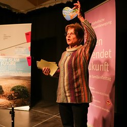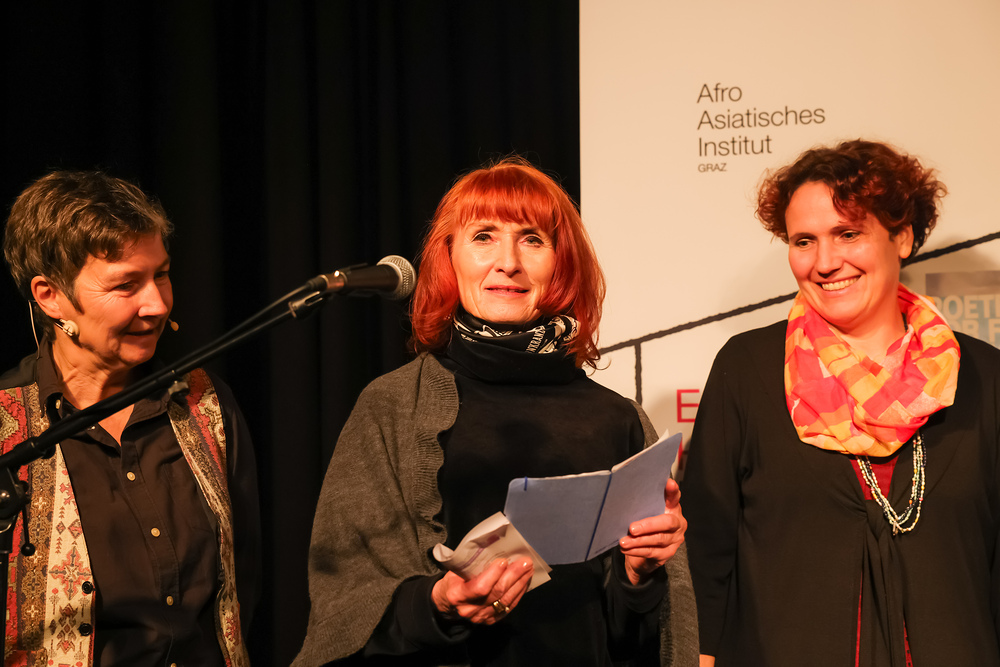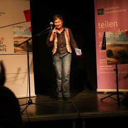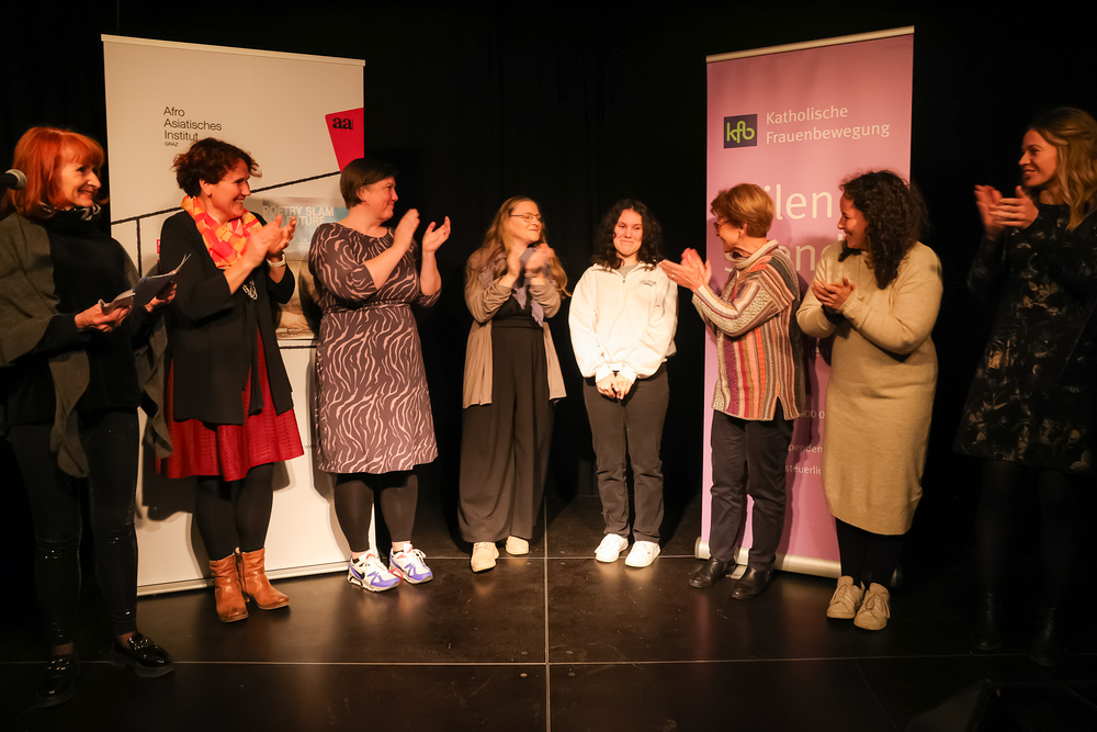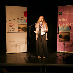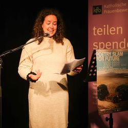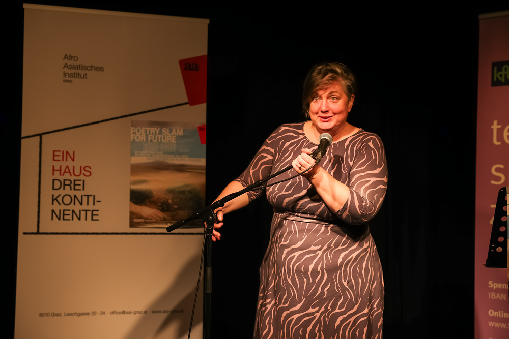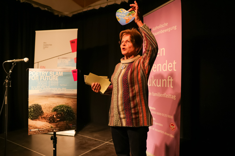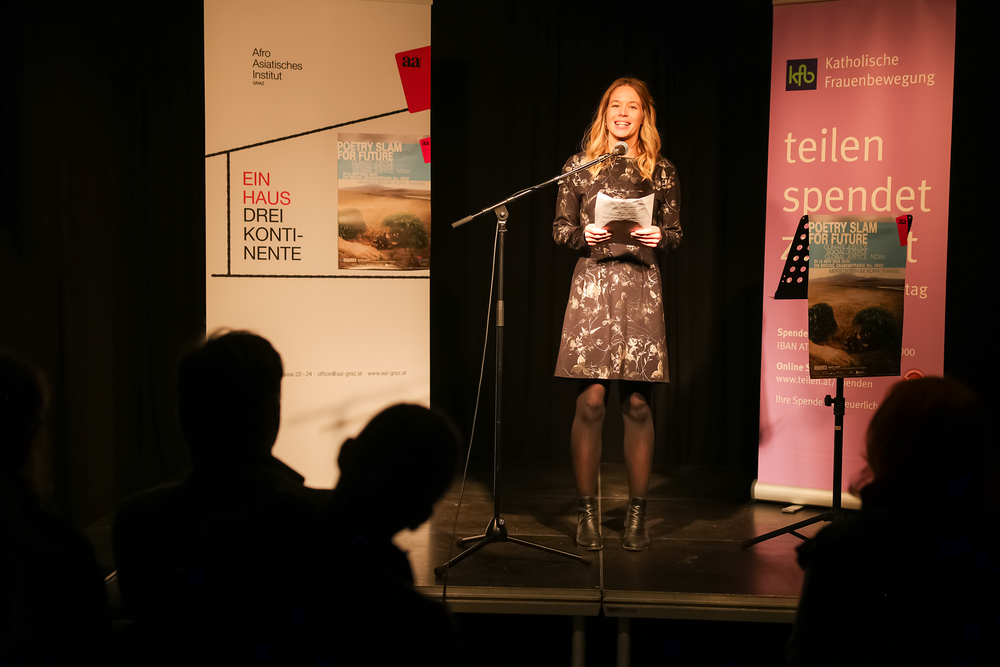 Menschen waren eingeladen, auf der Bühne einen selbst verfassten Text zum Thema (Klima-)Gerechtigkeit vorzutragen, eingebettet in einem gemischten Programm mit Künstler:innen und Aktivist:innen, moderiert von Christine Teichmann, Autorin, Kabarettistin und Slammerin. Organisiert wurde der Abend von der Aktion Familienfasttag der Katholischen Frauenbewegung gemeinsam mit dem Afro-Asiatischen Institut Graz.