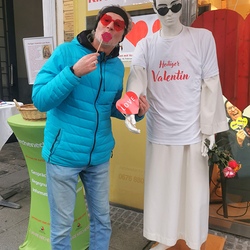 Ein Fotopoint mit einer als Valentin von Rom gestalteten Schaufensterpuppe lud zahlreiche – vor allem junge Menschen – zu Selfies, Arm in Arm mit Valentin, in Augenkontakt oder fröhlich nebeneinander ein. Mitarbeitende des Kirchenecks und der Stadtkirche übergaben ca. 350 Liebesbriefe von Gott, die seine Liebe zu allen Menschen zum Ausdruck brachte. In den zahlreichen Gesprächen wurde deutlich, dass es oft nur wenig braucht, um als Kirche mit den Menschen unterwegs zu sein, ganz unmittelbar in ihrem Alltag.