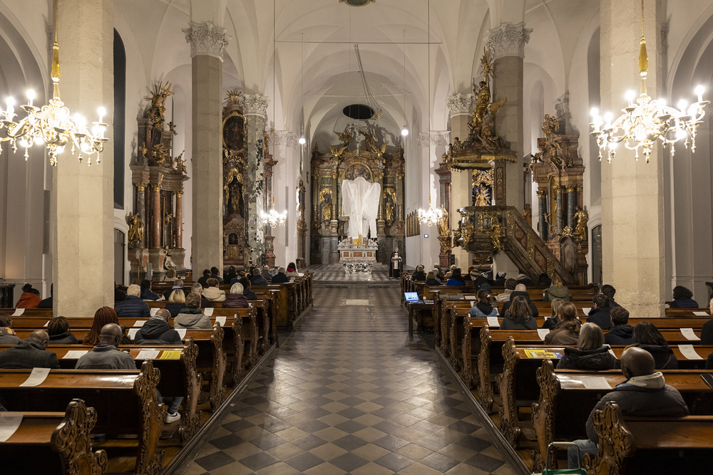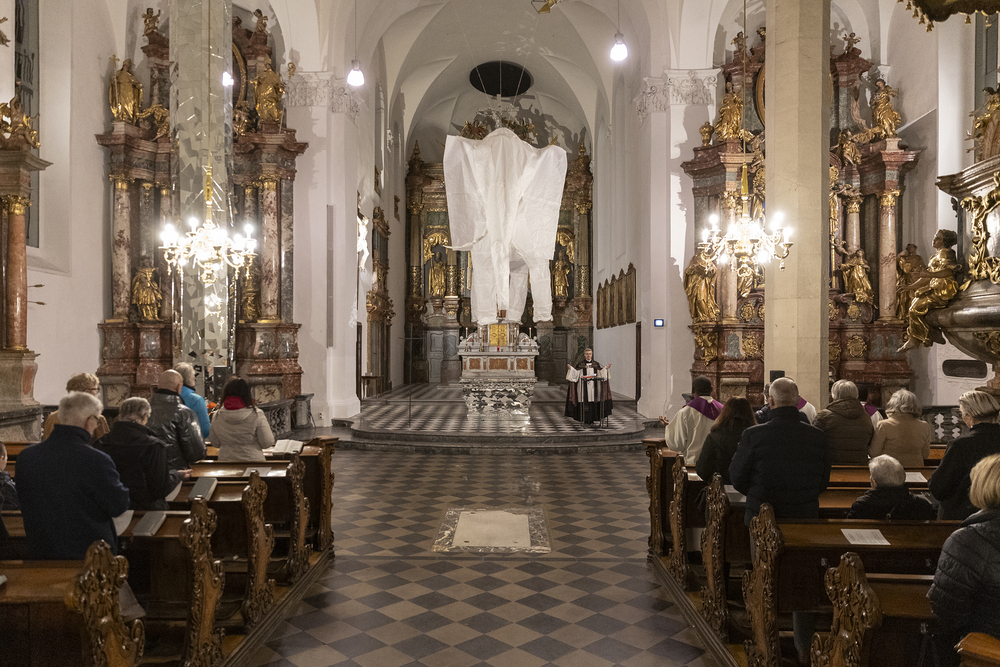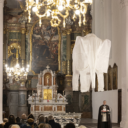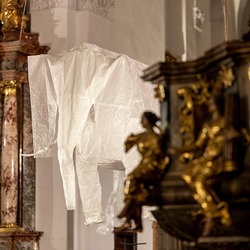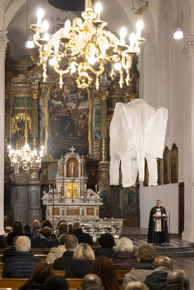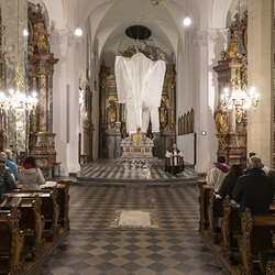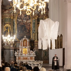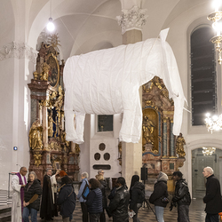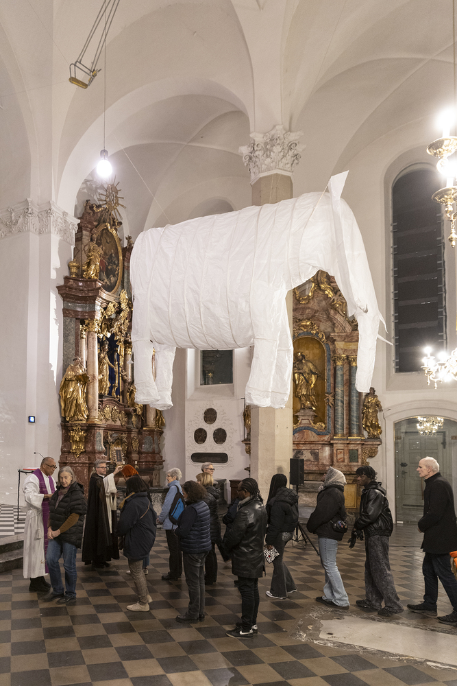 Edgar Honetschläger ist ein österreichischer bildender Künstler, Drehbuchautor, Filmregisseur und Umweltaktivist. Honetschläger ließ einen schwebenden weißen Elefanten den Kirchenraum füllen. "Der Elefant steht für Außenseitertum und Nicht-Akzeptanz, doch durch die Erfahrung seiner Leichtigkeit soll sich diese Perspektive auflösen". Die Installation ist bis Ostern in der Pfarrkirche Graz-St. Andrä zu sehen. Begleitet wurde die Liturgie von den einzigartigen Klängen von Abby Lee Tee.