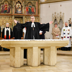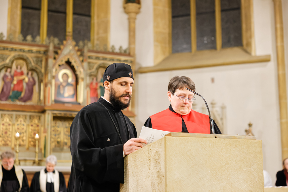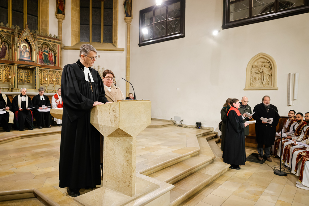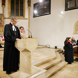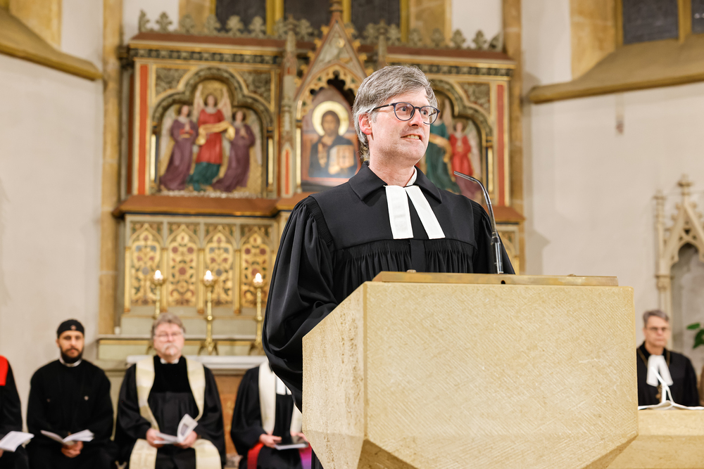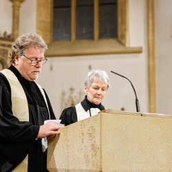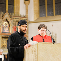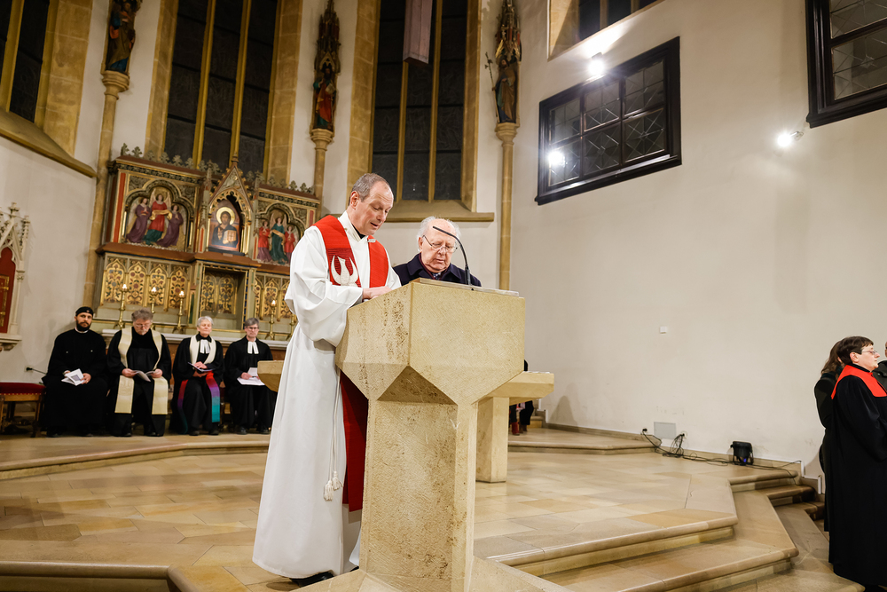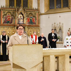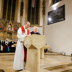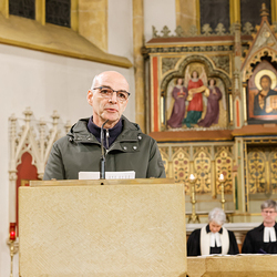 Matthias Weigold, Pfarrer der ev. Heilandskirche, trug die Predigt von Susanne Lechner-Masser vom Zentrum für Jüdische Kulturgeschichte der Universität Salzburg vor, die aus familiären Gründen verhindert war.