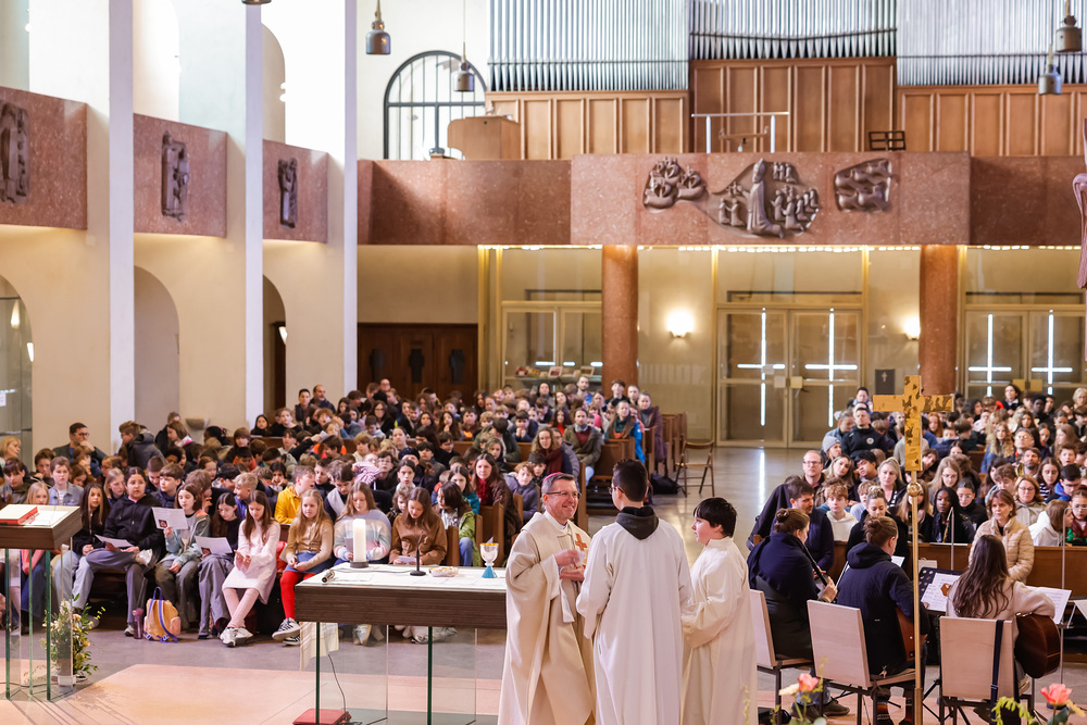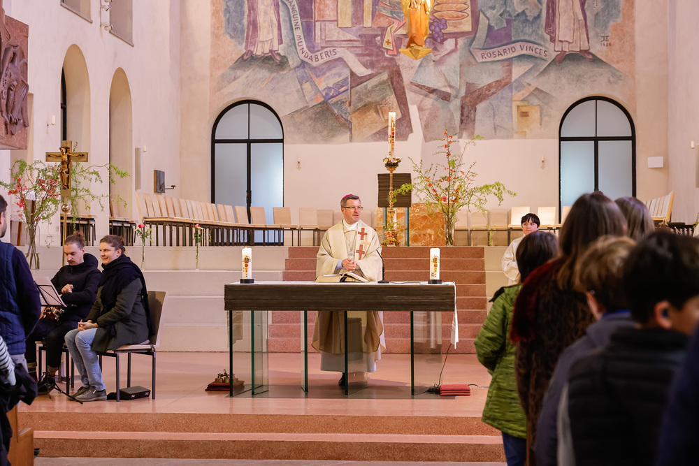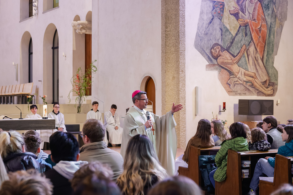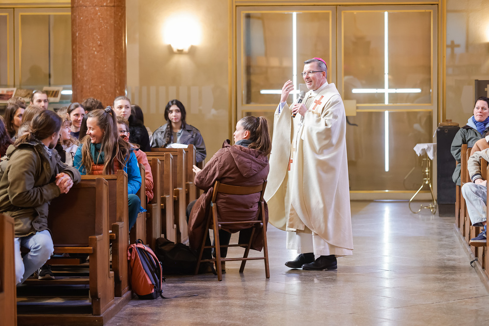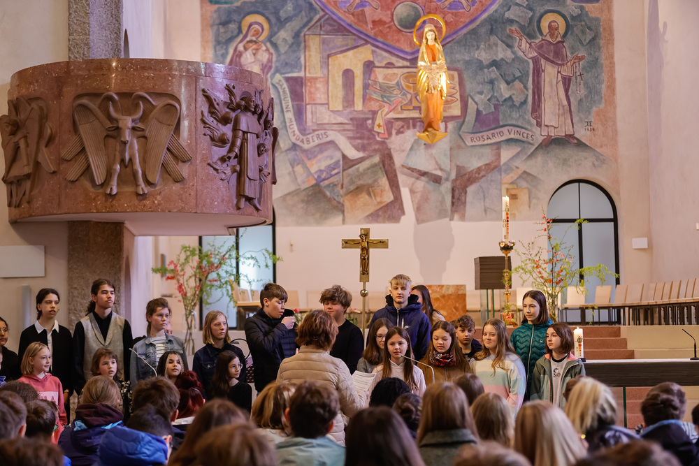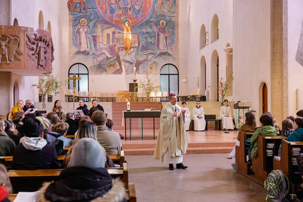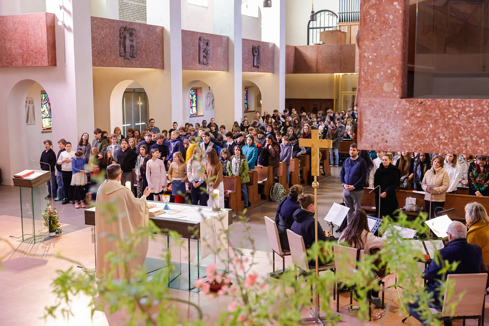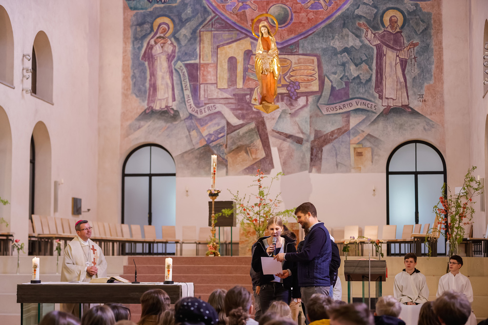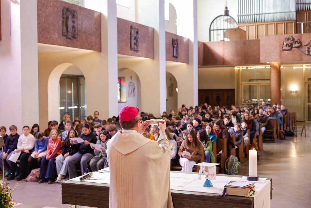 Weihbischof Johannes Freitag feierte mit der Schulgemeinschaft, darunter 400 Schülerinnen und Schüler der Mittelschule der Ursulinen. Unter dem Motto „brannte uns nicht das Herz?“ wurde noch einmal das Emmausevangelium verkündet. In seiner Predigt ging Weihbischof Johannes auf das „Gott fühlen“ ein. Der Gottesdienst wurde musikalisch von musizierenden Lehrer:innen und dem Schulchor begleitet.