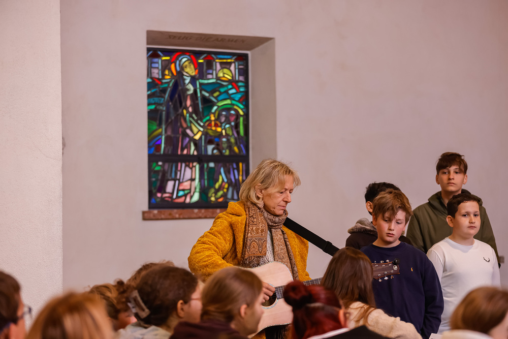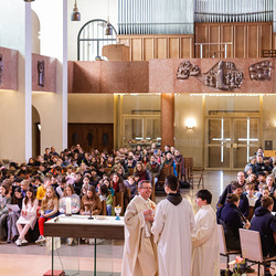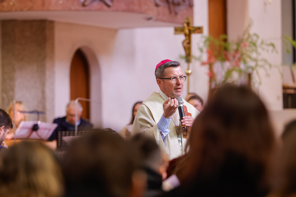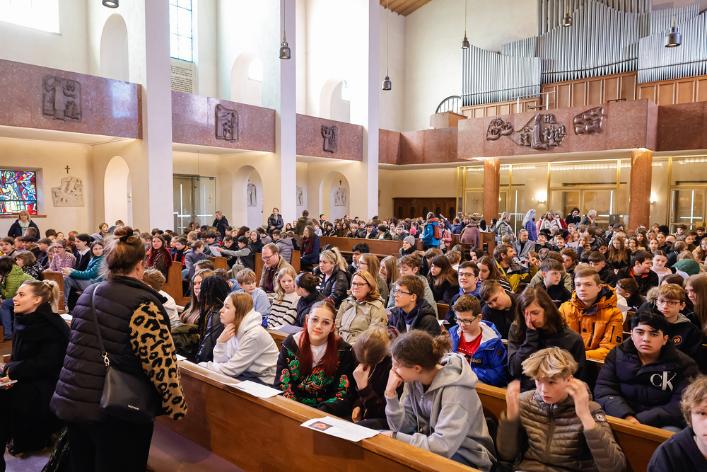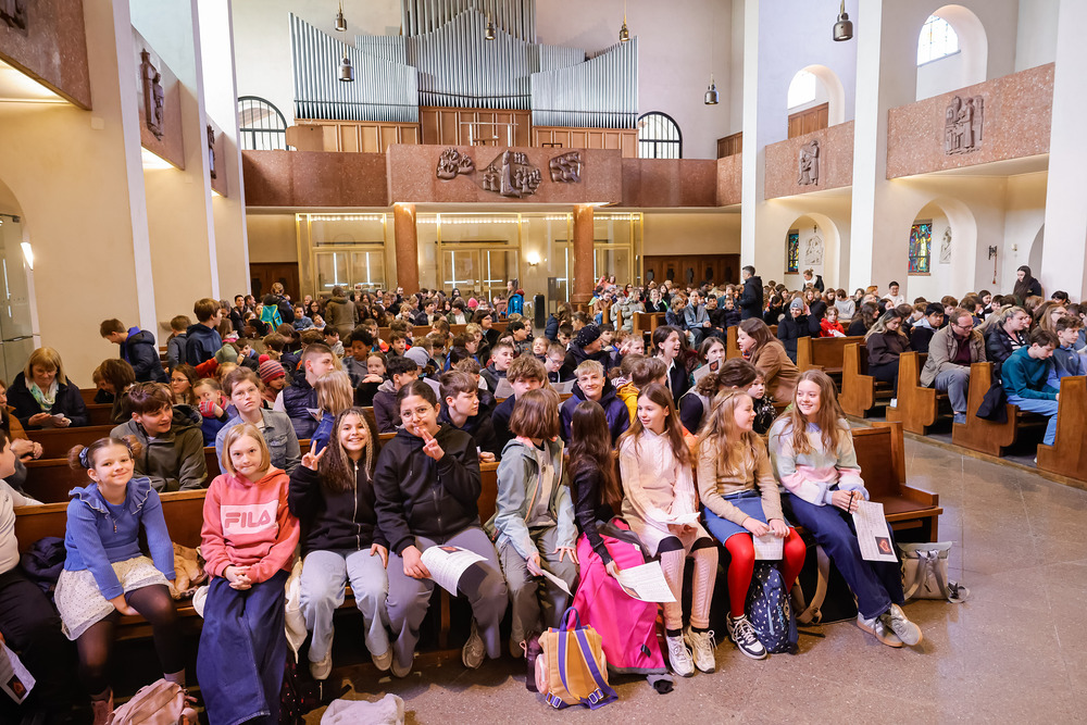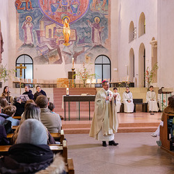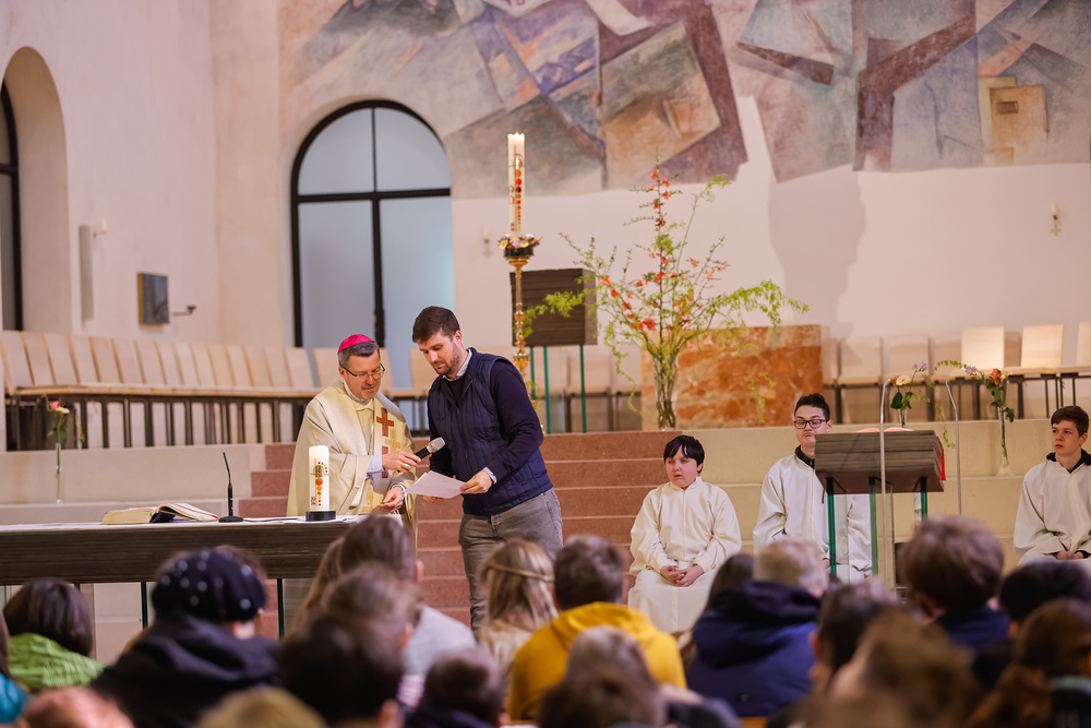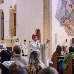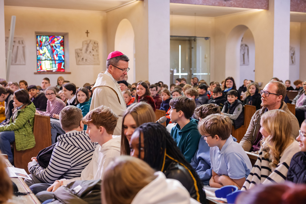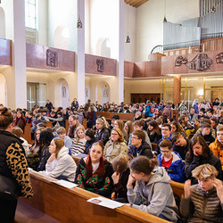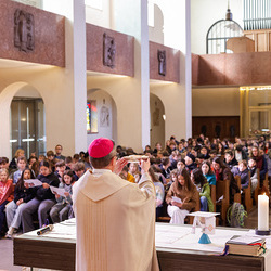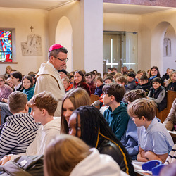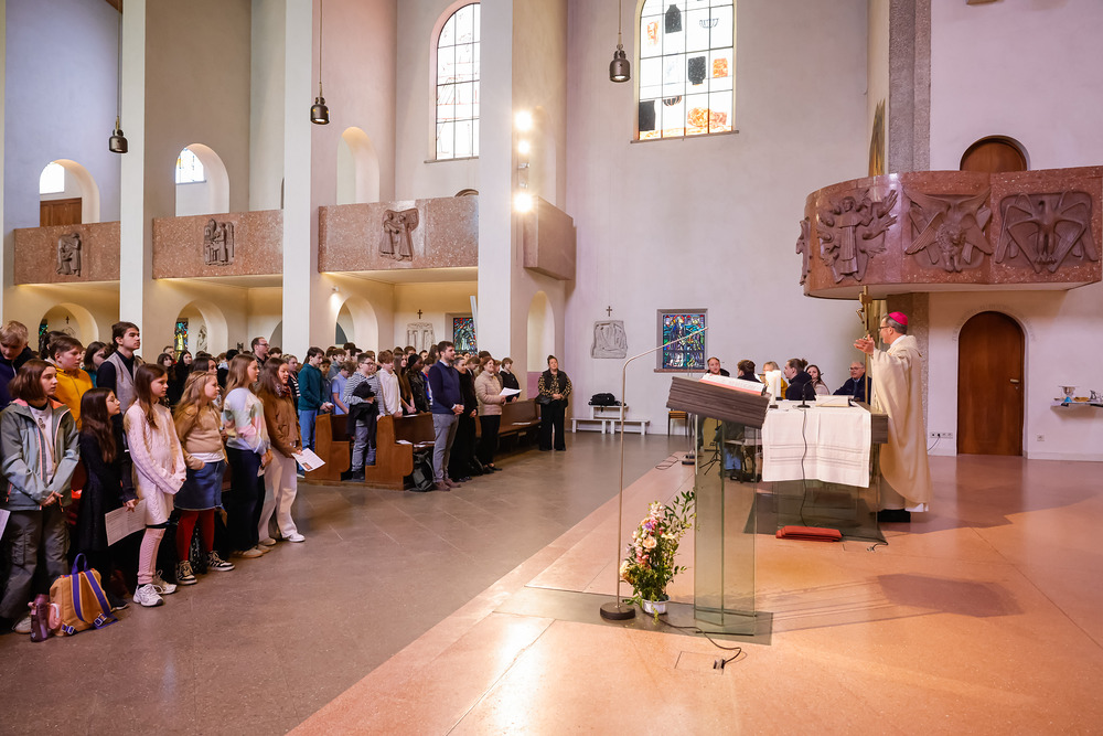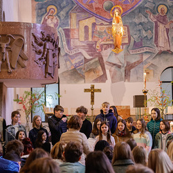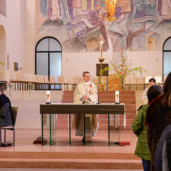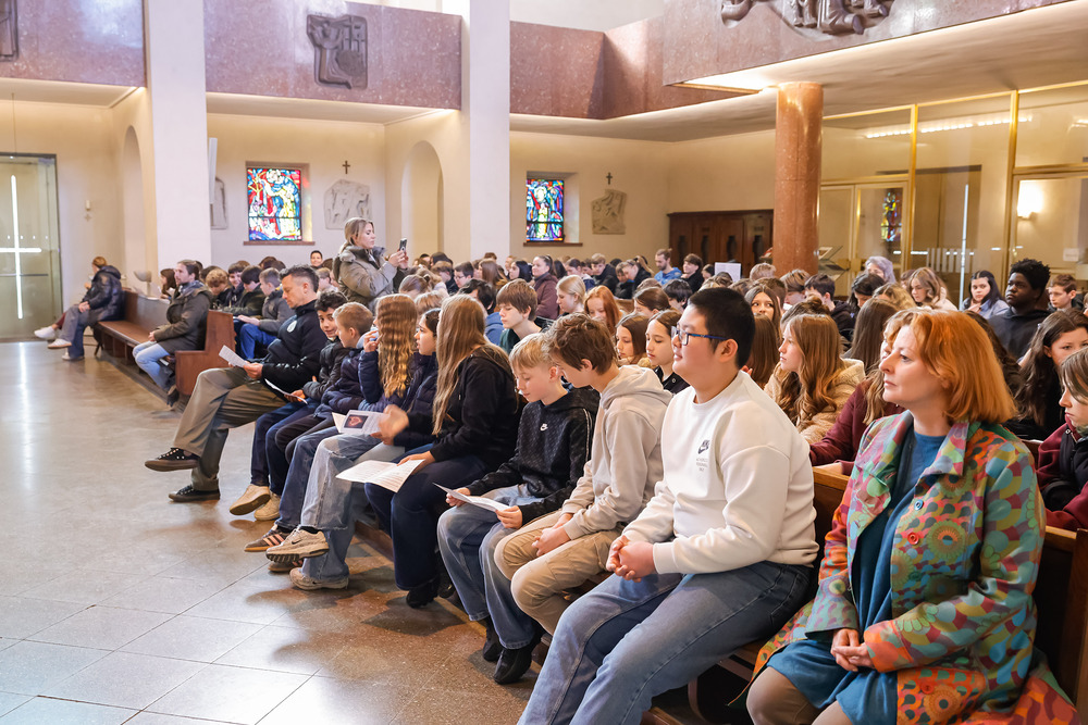 Weihbischof Johannes Freitag feierte mit der Schulgemeinschaft, darunter 400 Schülerinnen und Schüler der Mittelschule der Ursulinen. Unter dem Motto „brannte uns nicht das Herz?“ wurde noch einmal das Emmausevangelium verkündet. In seiner Predigt ging Weihbischof Johannes auf das „Gott fühlen“ ein. Der Gottesdienst wurde musikalisch von musizierenden Lehrer:innen und dem Schulchor begleitet.