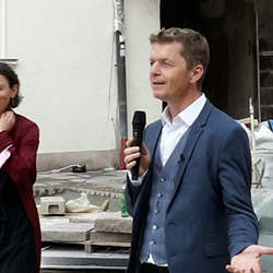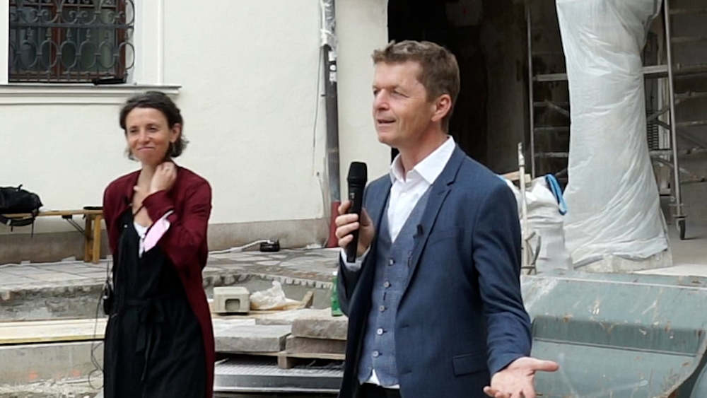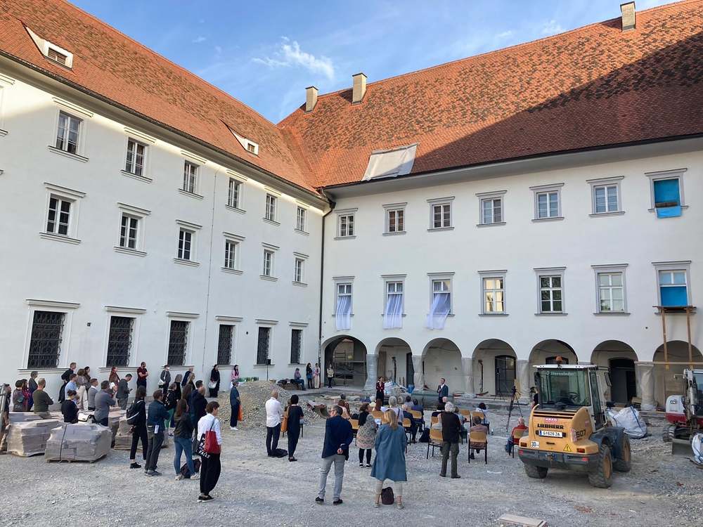 Es war eine extrem dichte Erfahrung – die Eröffnung von EINATMEN - AUSATMEN. Es war sozusagen die erste Veranstaltung im noch gar nicht fertigen Minoriteninnenhof - mitten in der Baustelle. Was eine Not war, wurde zum Highlight. Die Vorhänge von Nina Schuiki wehten aus drei Fenstern. Eine Künstlerin meinte sogar, es war für sie wie "Biennale-Feeling" - so mitten in dieser Unfertigkeit und der italienischen Architektur. Bischof Egon Kapellari war anwesend, ebenso Walter Prügger vom Ressort Bildung, Kunst und Kultur und P. Petru vom Minoritenkonvent. Ein neues Zeitalter beginnt hier.