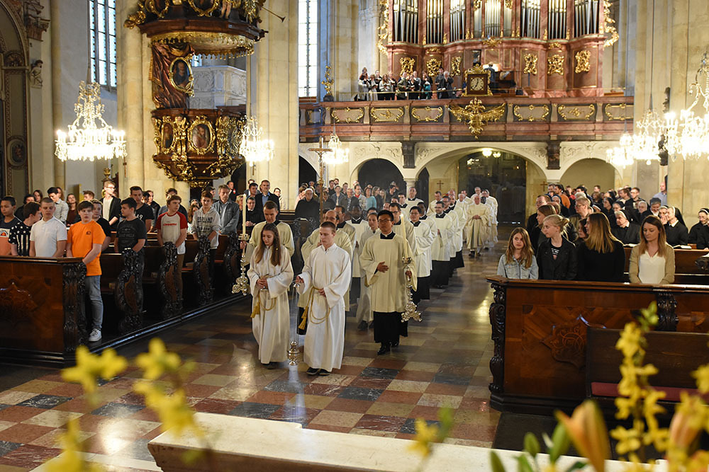 Bei der hl. Messe zur Firmung wird oft das Evangelium des Pfingstsonntags verkündet. Jesus, der Auferstandene, sagt zu den Jüngern: „Empfanget den hl. Geist!“ Wir hören, dass die Apostel durch diese Begegnung mit Christus von innerer Freude erfüllt, mit neuem Mut ausgerüstet, vom Geist Christi erfasst worden sind. Und wir beten, dass dieser Geist auch uns geschenkt wird: „In ihm leben wir, bewegen wir uns und sind wir“ (Apg 17,28).