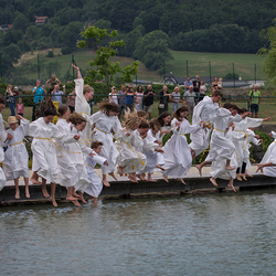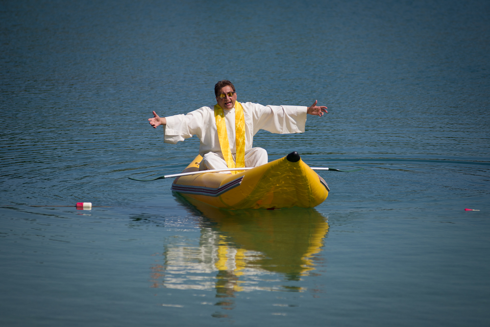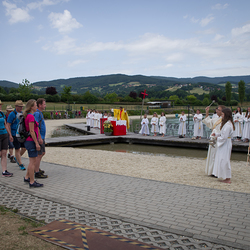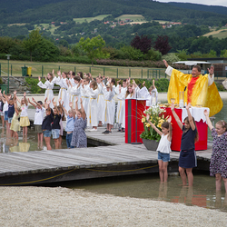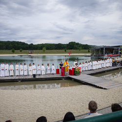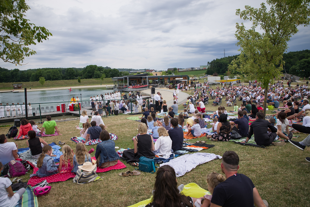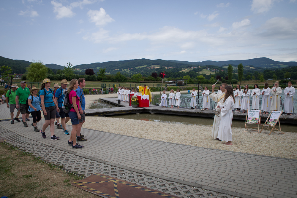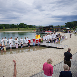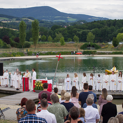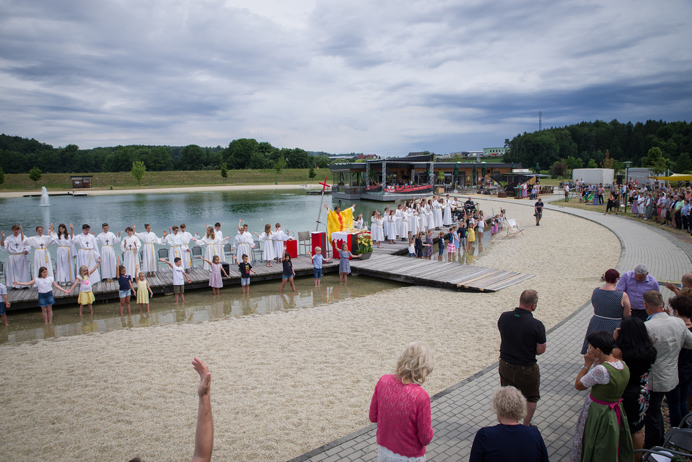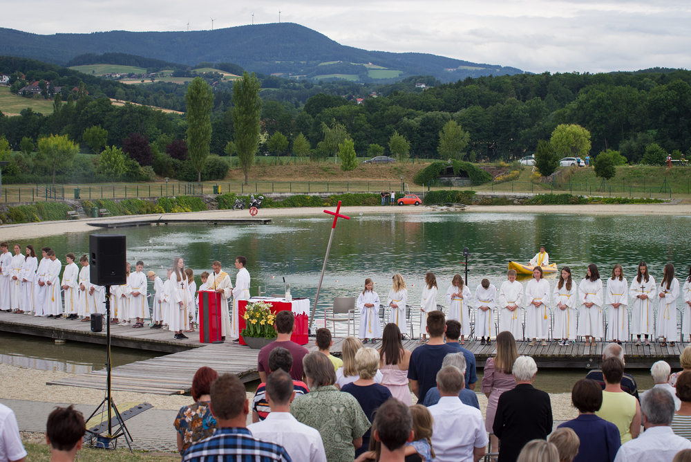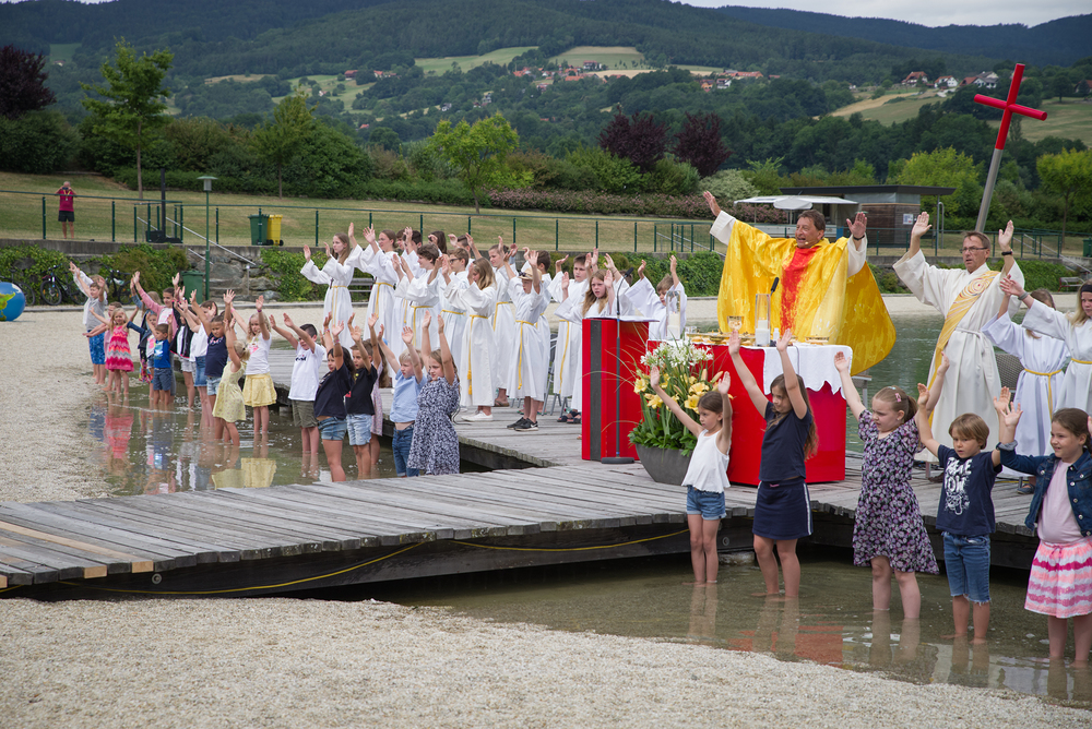 Auf Picknickdecken in der Wiese, im Liegestuhl oder mit den Füßen im kühlen Wasser feierte die Pfarre Hartberg eine Seemesse unter dem Motto des Psalmenwortes mit kreativen Gestaltungselementen, der Altar auf dem Steg, gesäumt von vielen Ministrant*innen. Pfarrer Josef Reisenhofer predigte mitten im See vom Boot aus über die Kraft des Vertrauens auf Gott, der, wie das Wasser, die verschiedenen Lebensboote trägt. Am Ende des Gottesdienstes wurde der Reisesegen erteilt. Tausende waren via ORF und Internet dabei. Nachzusehen ist diese Feriensegensmesse unter www.igod.at