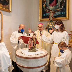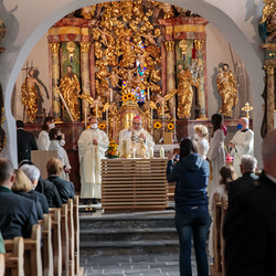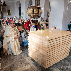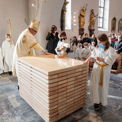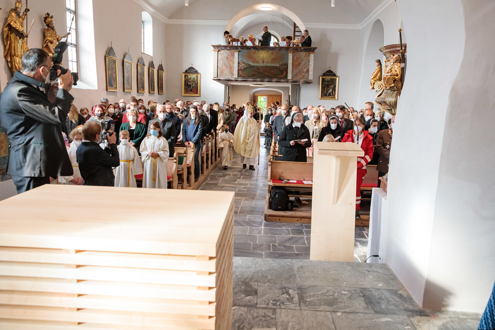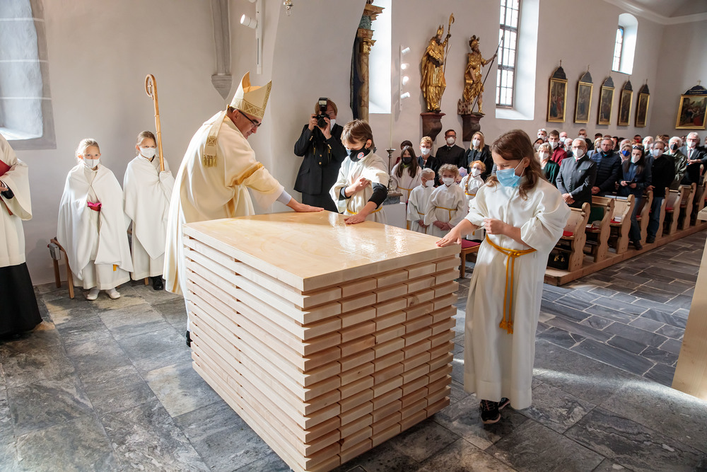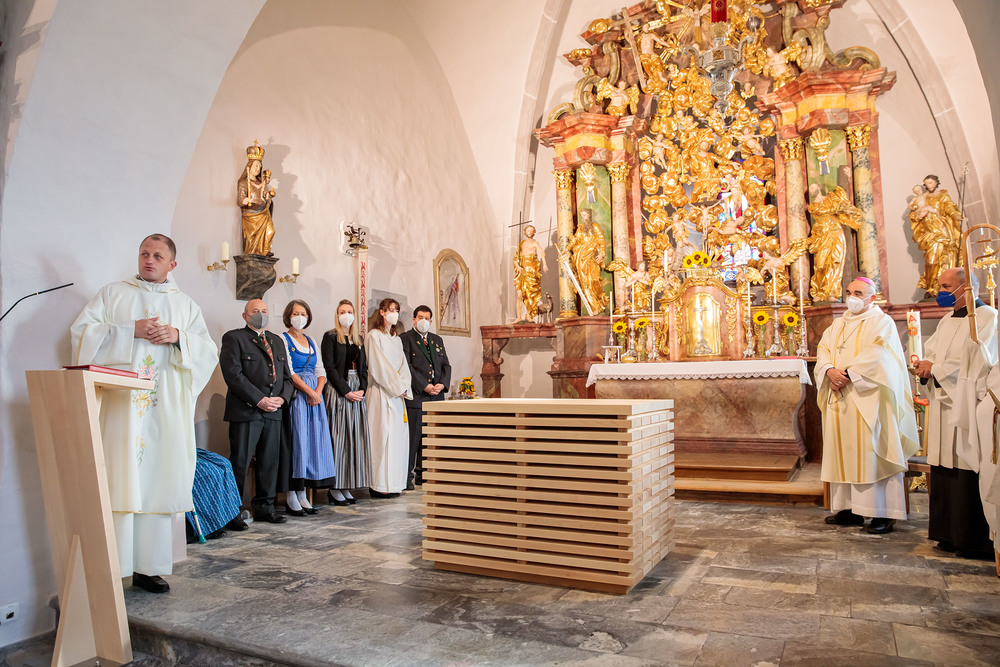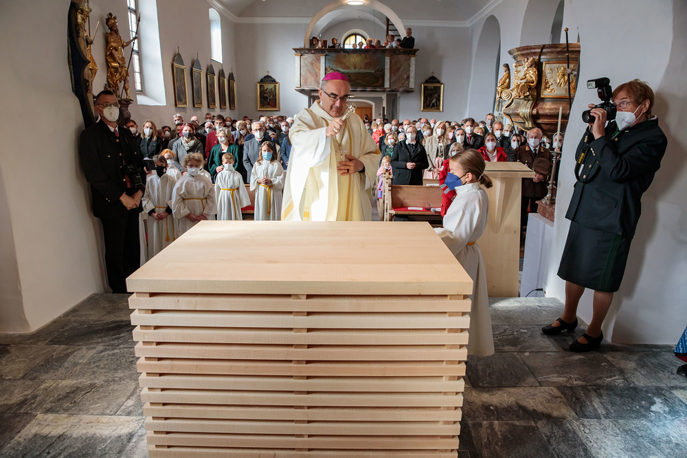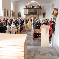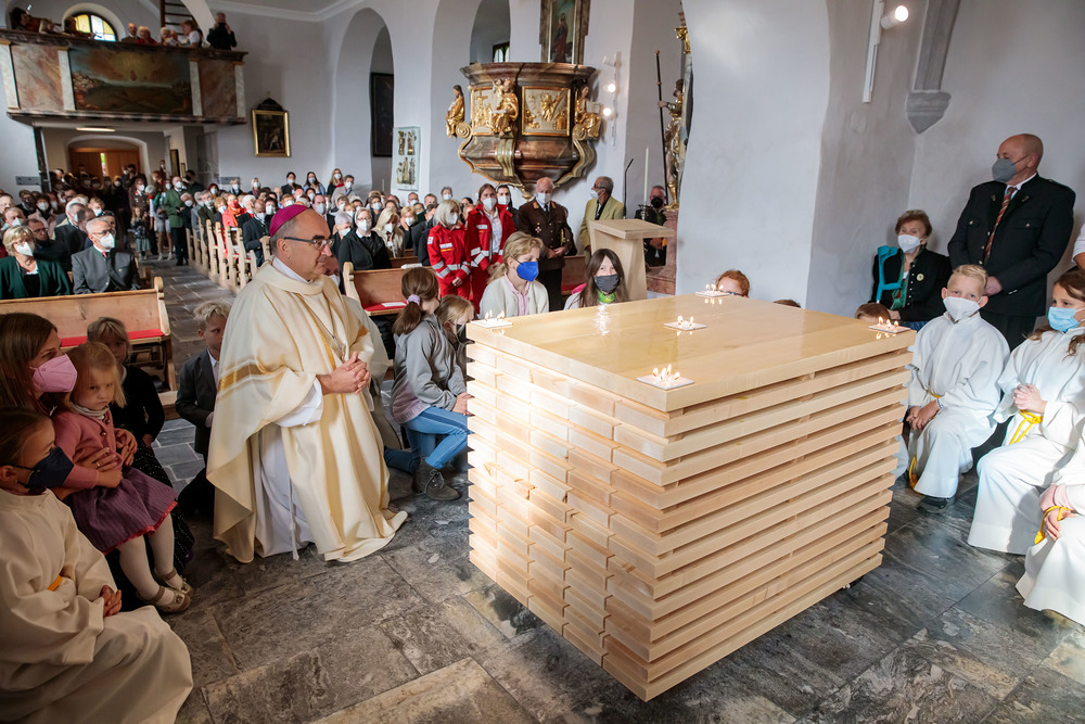 Nach Abschluss der Renovierungsarbeiten nahm Bischof Wilhelm Krautwaschl im Rahmen eines Festgottesdienstes die Weihe des neuen Altars in der Pfarrkirche zum hl. Apostel Thomas in Scheifling vor. Der Altar wurde von Gottfried Greiner gestaltet.