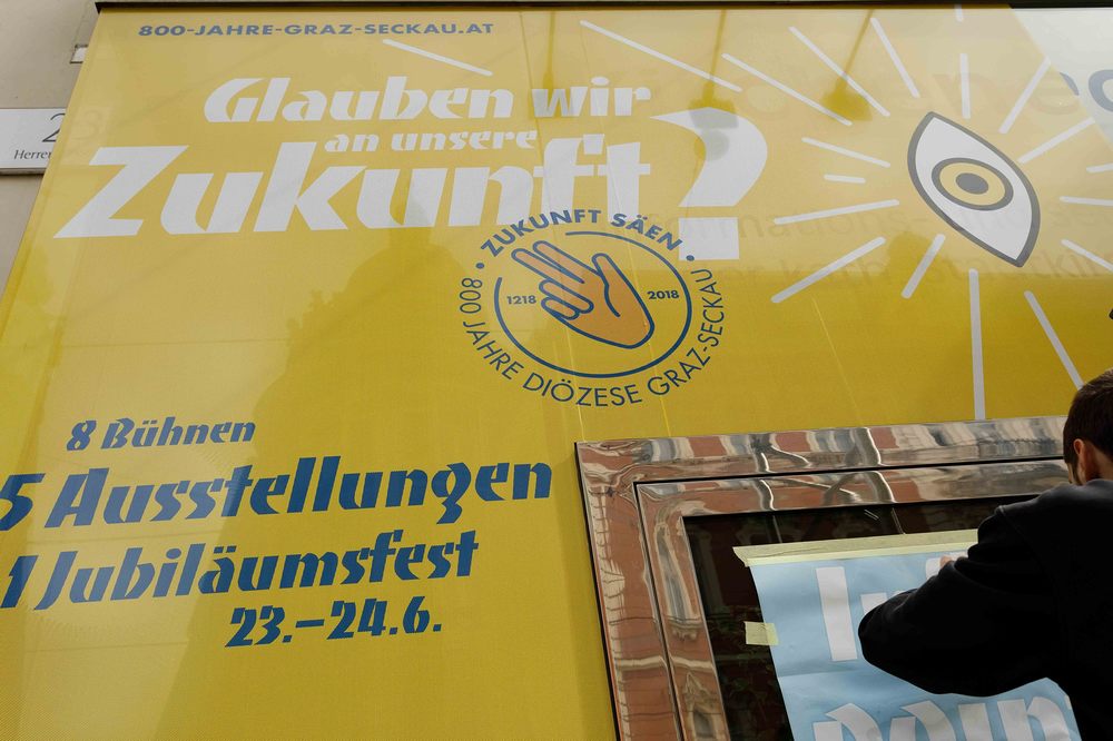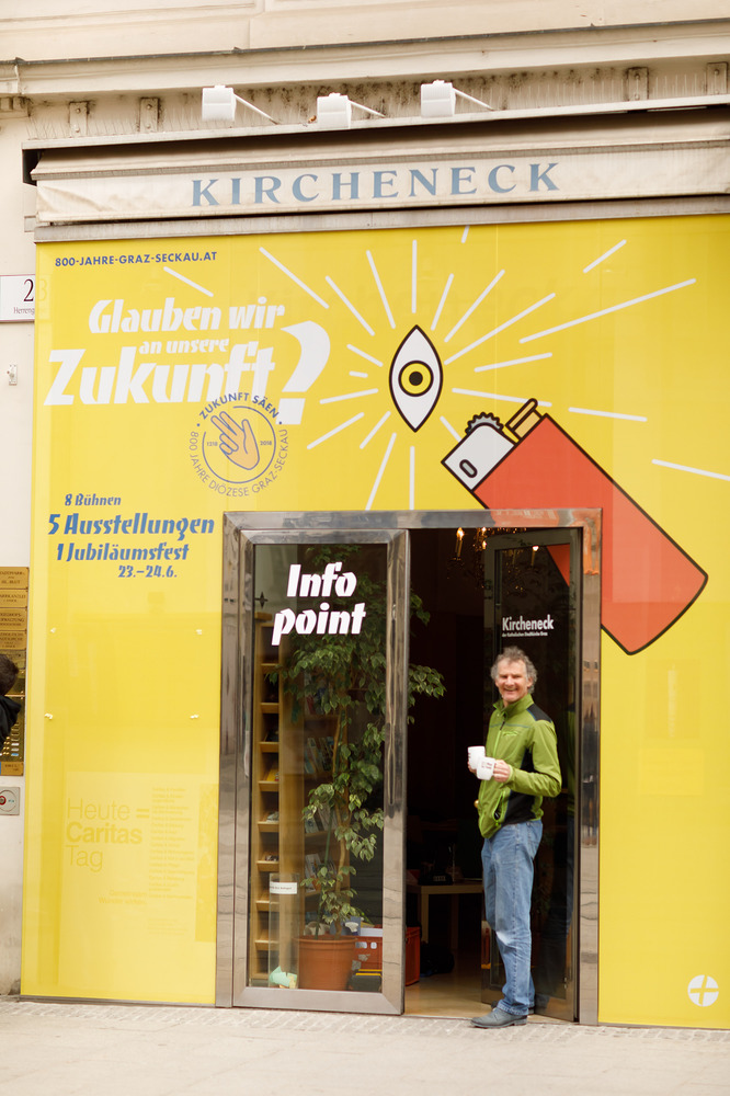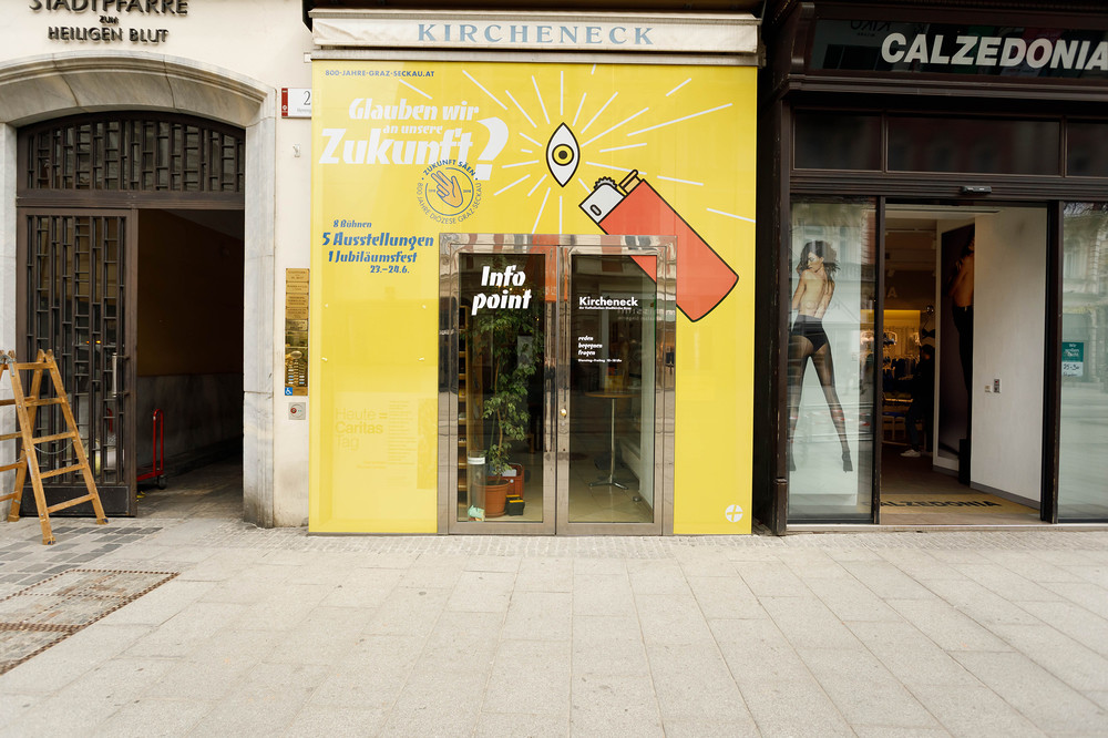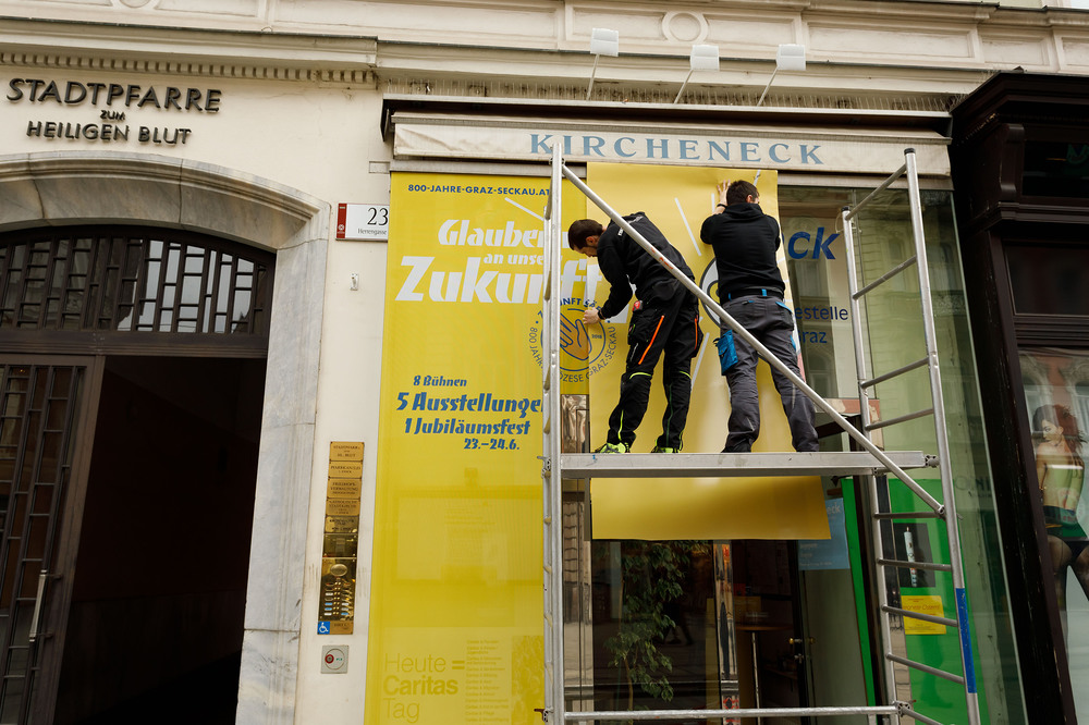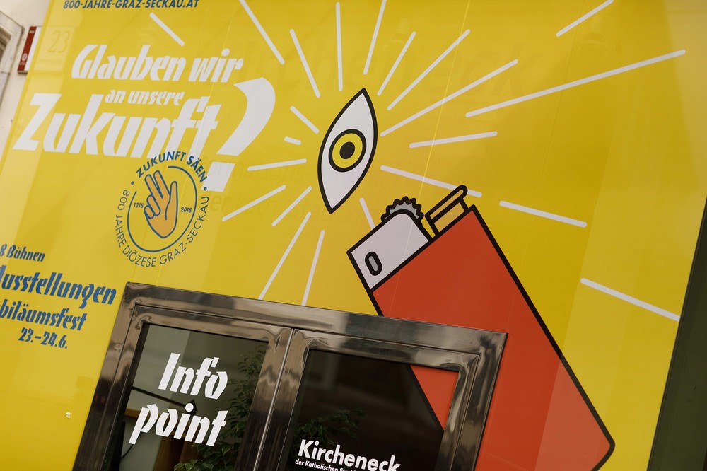 Das Kircheneck in der Herrengasse erstrahlt in neuem Glanz und ist nun weithin sichtbar der zentrale Infopoint für alles rund um das Diözesanjubiläum.