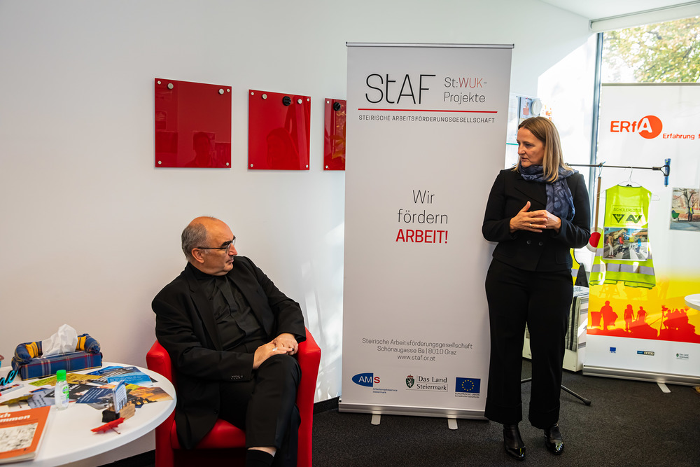 Beim Langen Tag der Beratungsstelle MeinRat kam Bischof Wilhelm Krautwaschl mit langzeitarbeitslosen Menschen ins Gespräch. Die vom AMS Steiermark finanziell unterstützte Einrichtung MeinRat stellt in allen steirischen Regionen Betroffenen ein Angebot zur persönlichen Stabilisierung bereit und erhöht so die Chancen auf eine berufliche Reintegration.