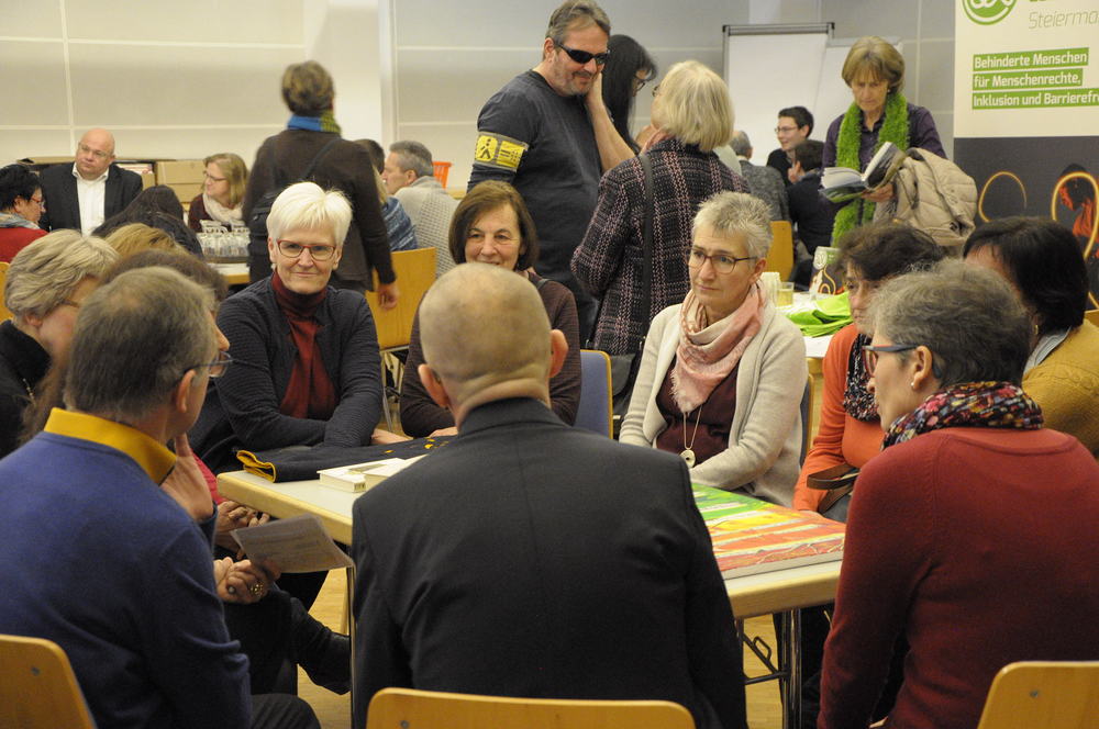 An Thementischen wurde in der Folge aufgezeigt, wie dieser Dialog in konkreten Initiativen schon gelingt. Einrichtungen wie das Kältetelefon, die Initiative „Eingefädelt“ aus Judenburg, die Plattform „Selbstbestimmt leben“ des Landes Steiermark oder der Retzhof als „erstes barrierefreies Bildungshaus Österreichs“ beschrieben, wie ein barrierefreies Miteinander in der Praxis konkret funktionieren kann.