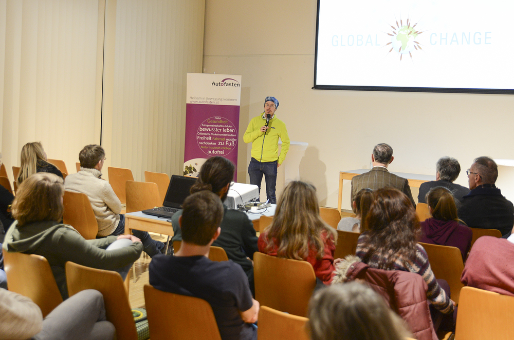 Gregor Sieböck, der Weltenwanderer, nahm uns bei der Autofastenstartveranstaltung ein Stück weit mit in seine Welt des Gehens, Staunens und Dankbarsein. Er berichtete von seinem "Heilsam in Bewegung kommen", seinen Abenteuern und Begegnungen mit beeindruckenden Bildern. Autofasten fällt ihm ganz leicht, er besitzt keinen Führerschein und auf die Frage, wie er es geschafft habe, so weit zu kommen, kann er nur antworten: "Ganz einfach ohne Auto!"