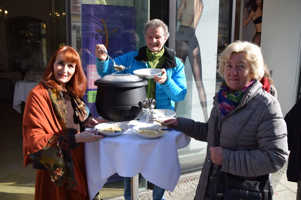 Lateinamerikanische Stimmung kam nicht nur durch die Gespräche, sondern auch durch die Gitarrenklänge von Juan Carlos Sungurlian auf. Ein großer Dank gilt dem Café Mild und Martin Auer, die die sehr schmackhafte indische Gemüsesuppe und das Brot gesponsert haben. Als Valentinsgruß bekamen alle UnterstützerInnen eine gelbe Narzisse, gesponsert von der Gärtnerei Lienhart, überreicht.