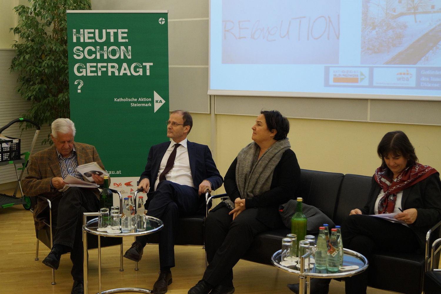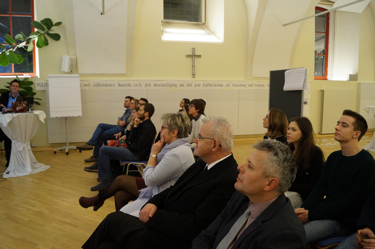 Nach den ersten Modulen (Politische Grundbegriffe; Partizipation; Europa; Sprache und Medien) folgte in Seggauberg ein abschließender Block: Thomas Götz (Kleine Zeitung), Franz Küberl (Caritas-Präsident a. D.) und Astrid Polz-Watzenig (Grazer Gemeinderätin) diskutierten mit Moderatorin Andrea Kager-Schwar und den Kursteilnehmenden über die Rolle von Religion im Staat und von Christinnen und Christen in Gesellschaft und Politik.