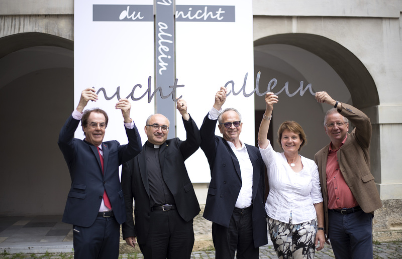 „Wie ein kleiner Junge, der staunend und fröhlich seinen Geburtstag mit Freunden und seiner Familie verbringen kann: als wunderbares, großes Geschenk“, so hat sich das Bild vom Jubiläumsfest am 23./24. Juni bei Bischof Wilhelm Krautwaschl eingeprägt. Nun freue er sich auf das „Geschenk für die Steiermark“, ein von Medienkünstler Richard Kriesche gestaltetes Kreuz, das am 1. September zum feierlichen Abschluss des Jubiläums am 2.018 m hohen Himmelkogel inmitten der Triebener Tauern enthüllt wird. „Das Kreuz zeigt, was im Letzten der Glaube an Jesus Christus ausmacht: Vom Kreuz geht alles aus, und auf das Kreuz geht alles hin. Das Kreuz ist sozusagen der Kreuzungspunkt zwischen Himmel und Erde“, formulierte der Bischof. Als bleibendes und weithin sichtbares Zeichen ist dem Kreuz aus Flachstahl „du bist nicht allein“ eingeschrieben. Eine Weiterführung der Botschaft der Jubiläumsgabe, die am 24. Juni nach dem Festgottesdienst an alle Mitfeiernden als Zeichen lebendiger Solidarität verschenkt wurde.