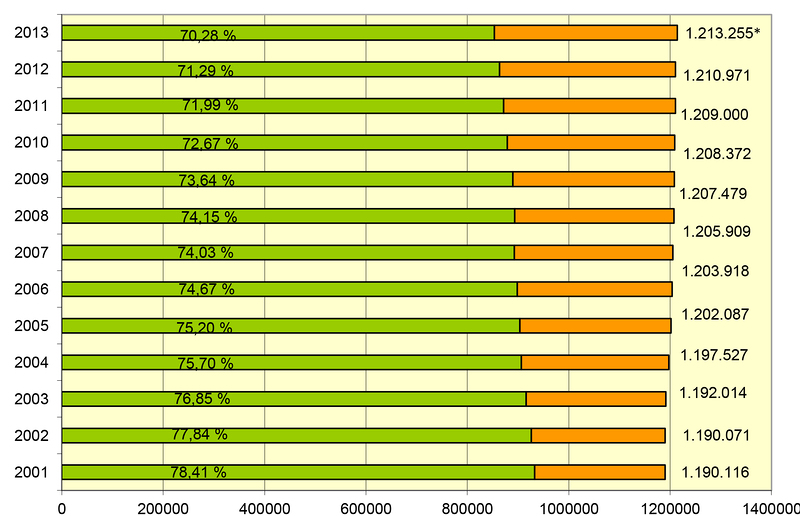 Mit Stichtag 31.12.2013 gab es in der Steiermark 853.594 katholische Bürgerinnen und Bürger. Der Katholikenanteil an der Gesamtbevölkerung (1,213.255) liegt somit aktuell bei 70,28 % (vor einem Jahr waren es 863.285 Katholiken und 71,29 %).