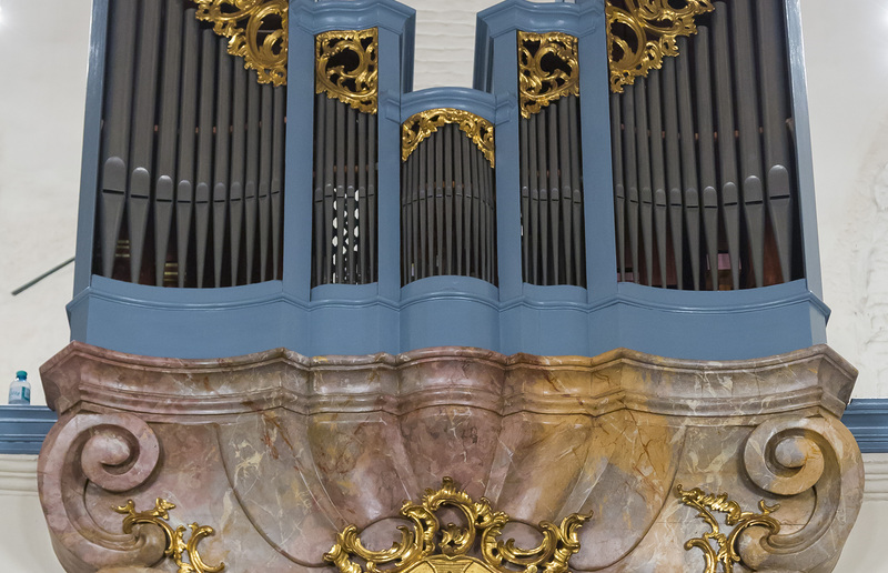 Die Orgel ist deshalb ein "historischer Glücksfall", da sie 1932 beim Einbau einer neuen Orgel still gelegt wurde. Damit ersparte man dem Instrument, das 1773 vom Grazer Orgelbaumeister Franz-Xaver Schwarz im spätbarocken Stil erbaut worden ist, den Umbau. Rund drei Viertel der historischen Pfeifenbestands konnte erhalten werden. Durch den Orgelbaumeister Wolfgang Karner (Haderswörth) wurden umfassende Reinigungs- und Restaurierungs- sowie sensible Ergänzungsmaßnahmen vorgenommen. Die Restauratorin Erika Thümmel hat mit ihrer Werkstatt den Prospekt, die prächtig marmorierte Konsole und die Engelputti aus dem Umkreis des bedeutenden steirischen Barockbildhauers Veit Königer in ihrer originalen Fassung wieder hergestellt. So erklingt das Instrument in der Grazer Universitätskirche wieder im spätbarocken Klangbild.