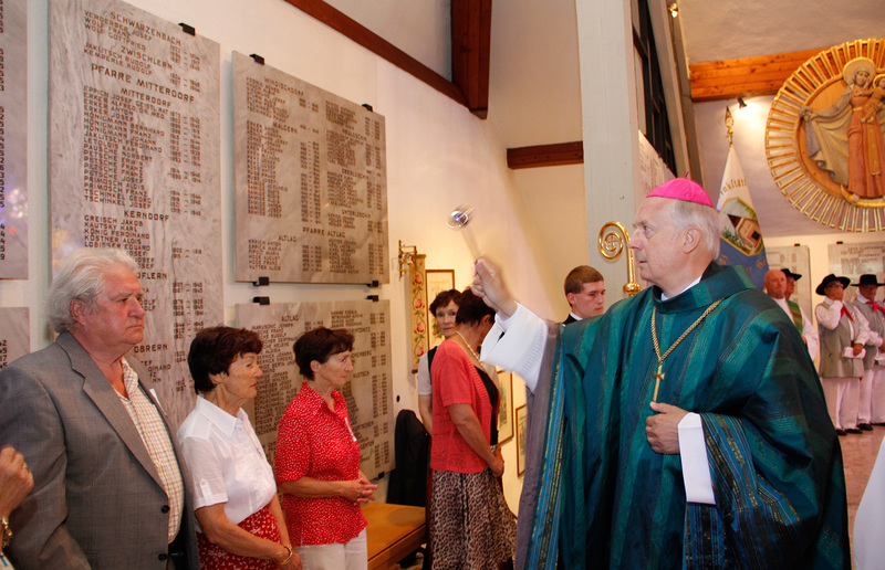 Vor dem Festgottesdienst segnete Diözesanbischof Kapellari die Gedenktafeln, die mit ihren Namen, nach Pfarren geordnet, an die Gottscheer Kriegs- und Vertreibungsopfer erinnert. Das Gottscheer Lied „Hin ts?n Pilde“(Hin zum Bilde) eröffnete den Festgottesdienst, den Bischof Kapellari gemeinsam mit den Gottscheer Geistlichen Militärsuperior Harald Tripp und Geistl. Rat Josef Rosenberger feierte. In seiner Predigt nahm Bischof Kapellari Bezug auf den Begriff „Heimat“. Dieser sei inhaltlich austauschbar. „Das kann die Mutter sein, die man damit meint, das Geburtshaus, oder das Grab der Mutter. Im Kern meint der Begriff Heimat Beziehung.“ Bischof Kapellari betonte auch die Notwendigkeit einer Balance zwischen Erinnerung und Hoffnung. „Wie ein Januskopf schauen wir immer zugleich mit einem Gesicht in die Vergangenheit, mit dem anderen in die Zukunft“, so der Oberhirte der Diözese Graz-Seckau. Die Fürbitten wurden in Gottscheerisch gesprochen. Bei der anschließenden Agape nutzen viele die Möglichkeit mit Diözesanbischof Kapellari ins Gespräch zu kommen.