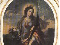 Darstellung: Als Einsiedlerin (Nonne) mit Krug und Brot, oder einem zweireihigen Kamm oder einem Fisch.